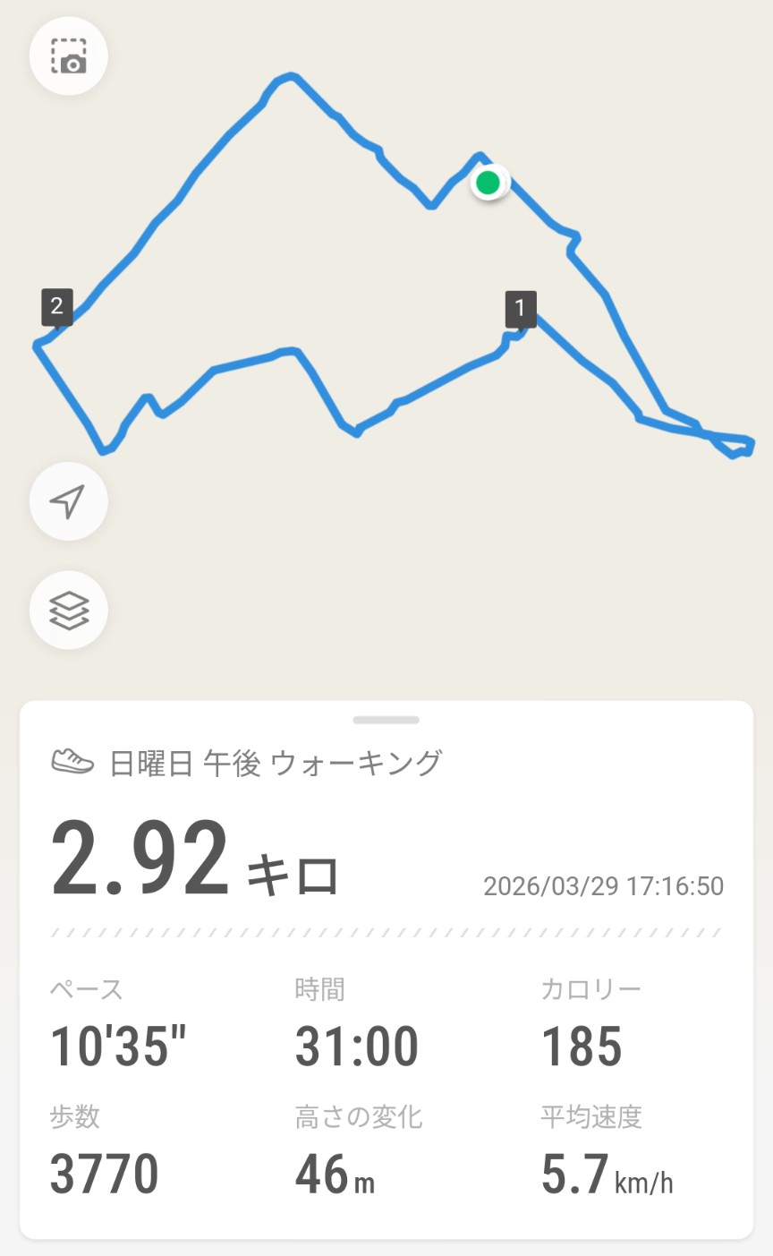 今日の散歩_20260329 健康の話 2026年3月29日(日) 19:46 今日の散歩。いつもの3kmコースを時速5km台でゆっくりのんびりと。ガソリン価格はまた7円下がっていました。いつ給油したら得なのか考えても仕方がないので、必要な時に必要なだけ入れるのが精神衛生上良さそうです。今日も黒ニャンコが暇そうに座っていました。