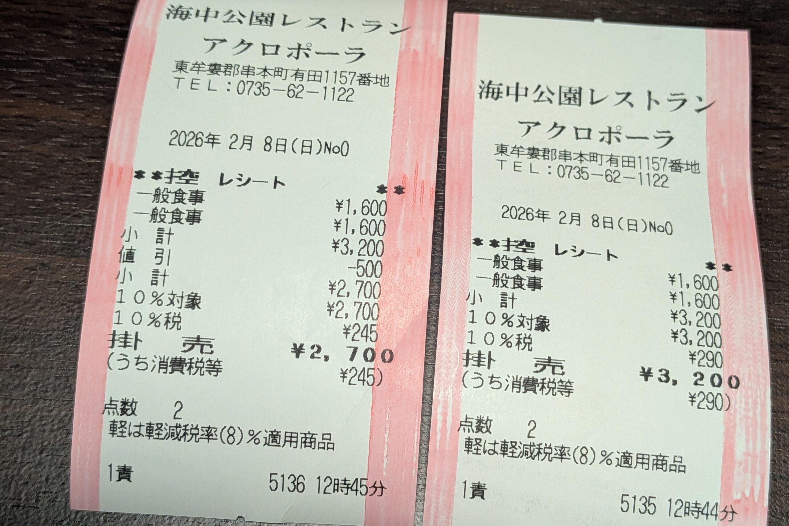 4月支払いのクレジットカードの明細を確認していたら、2月の南紀白浜旅行での串本海中公園レストランの引き落とし額がおかしいことに気づき、レシートを確認したら片方の会計で500円クーポンが適用されていないことがわかりました。家族の会計を3,000円以上で2つに分けて、それぞれにクーポンを使ったつもりでしたが、片方にその割引入力されなかったようです。その場でレシート見て気づくべきでしたが、割引の無いほうは奥さんが会計したものでクレジットカード決済だったので信用して確認しなかったみたいです。とりあえずダメもとで電話したら、謝罪とともに返金処理しますということで、会話だけであっけないくらいにスムーズに対応していただきました。実際の返金処理は時間がかかるようなので、本当に返金されるのか、いつ返金されるかはわかりませんが、気持ちの良い対応をしていただけただけで満足です。レシートの内容はその場で確認しないといけませんね。