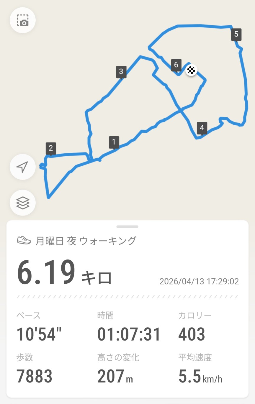 今日の散歩_20260413 健康の話 2026年4月13日(月) 18:002026年4月14日(火) 9:26 この前の久しぶりの散歩では、足のお尻の横が痛くなったり、すぐに足がだるくなっていましたが、今日は久しぶりにどこまでも歩いていける感覚を味わうことができました。途中で朝ご飯用の食パンやトマトを買って(合流した奥さんと長女に持って行ってもらった)、その後は遠回り、遠回りして戻ってきました。歩いた距離は6kmを超えていました。無理はしないようにこの調子で体力つけて脂肪を減らしていきたいと思います。