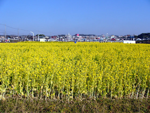 この菜の花畑は、市内の大学生が休耕田を借りて育てたものだそうです。夏は30万本のひまわり、そして今70万本の菜の花を咲かす「100万本の花づくりプロジェクト」という取り組みです。隣接の豊田スタジアムには展望台も設けられていて、この眺めを上からも見ることができます。