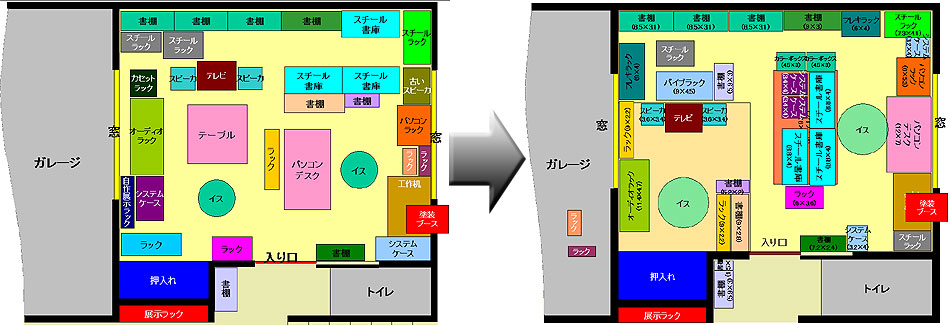 こういう時、大事なのはきちんとした計画。いいかげんに家具を動かしても効率よくありませんし、無計画だと模様替え自体を失敗することにもなりかねません。ということで書いたのが右の図。工作机とパソコン机を横並びにし、そこを作業スペースとしてまとめる。音楽を聴くスペースは、音場は悪くなるのは覚悟で現状のスペースをやや縮小。それであいた中央のスペースに高さの低い書棚などを集め、その上を鉄道模型のレイアウトスペースとして確保。模様替えの骨格は、だいたいそんな感じになりました。