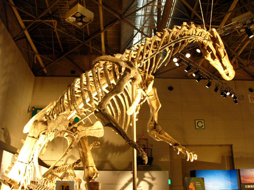 昼食後は、第2展示場で開催されている「恐竜大陸」に向かいます。こちらはけっこうな金額の入場料が必要ですが、今回はおとな2人分の招待券が入手できましたので末娘の入場料だけでOKでした。こちらの展示は、正直すごい展示でした。化石の全身骨格が約40体、リアルな動きをする恐竜ロボットが約20体と、ずっと見ていても飽きません。末娘もその恐竜ロボットの動きに魅せられてずっと向かい合ってその場をなかなか動くことなく興味深げに見入っていました。