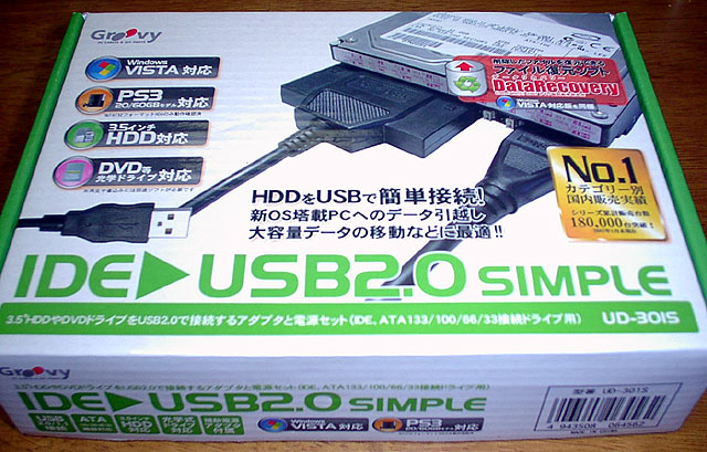 私の部屋には、自作パソコンのグレードアップに伴って単体で余っているハードディスクドライブ(HDDと略します。みっちゃんのえっちでーでーと言えばわかる人は笑う・・・)がいくつかあります。それらは、写真のような接続コードを買ってきて、単体でUSB接続してデータのバックアップなどに使っています。中には半病人のえっちでーでーもいますが、そういうものも、だましだまし有効に使っています。もっとも友人に言わせれば、そんな古くて遅いのをわざわざけち臭く使わなくてもいいじゃん、と言うのですが。