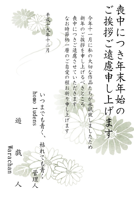 昨夜、半分ジョークで思いついた喪中メッセージなのですが、10種類以上あったテンプレートの中からこのデザインを選んだんですよ。