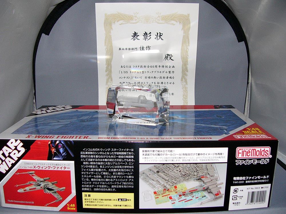 立派な賞状と商品のプラモデル。