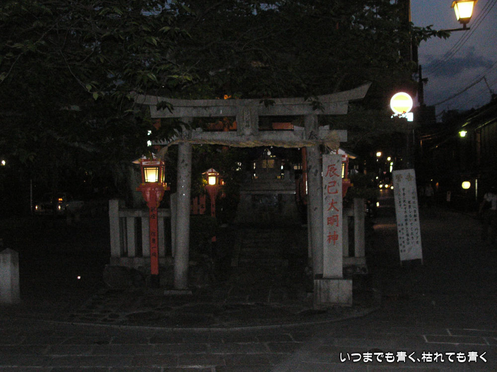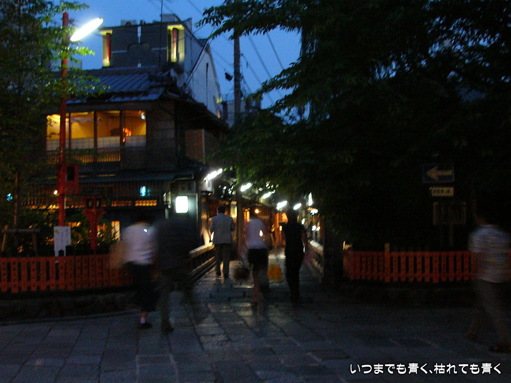 祇園のお茶屋さんが軒を連ねる花見小路通にはいって、夜の祇園の雰囲気を外から少し体験。いつかはこういうところで食事でもしたいものです。一通り散策したら、お目当ての巽橋と辰巳大明神のある場所に向かいます。行ってみるとどうってことないところなのですが、ここがいろんなドラマの舞台になったのだと思うだけで感慨深いものがあります。