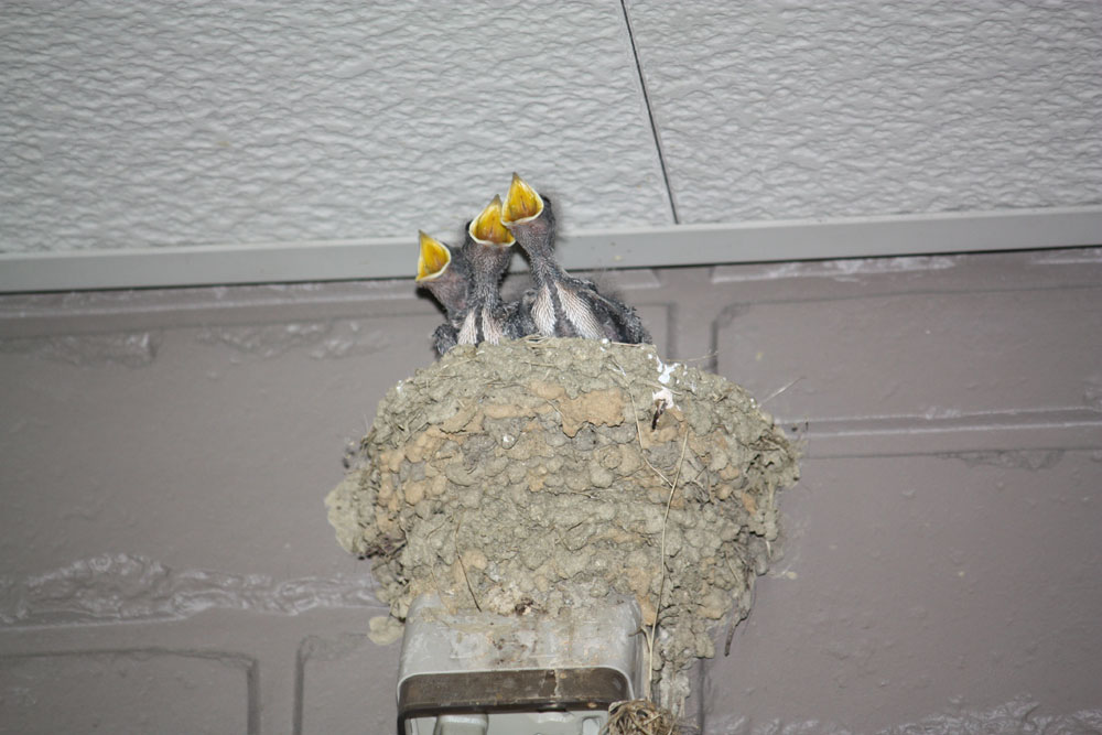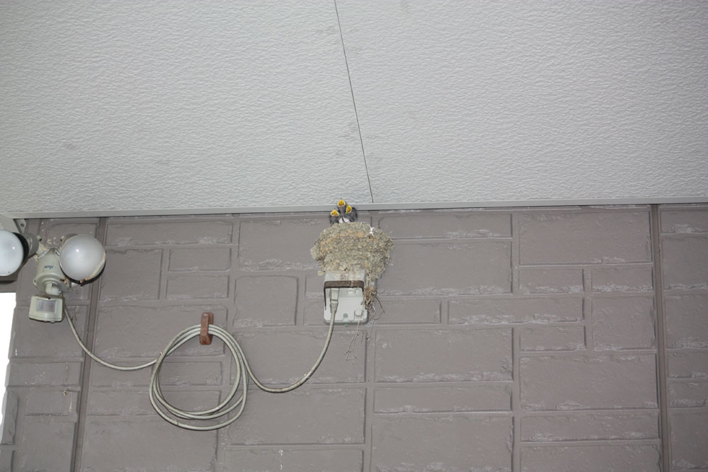 ストロボの光をあてると、びっくりするのか親鳥が来たと思うのか、三羽のヒナたちが「エサをくれ!」とばかりに目いっぱい黄色い口をあけます。このまま落ちたりせずに大きくなって巣立っていって欲しいものです。