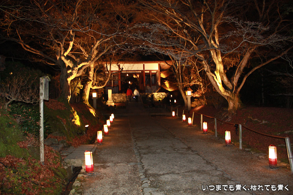 火のはいった灯篭が並べられた小径を南に歩いていくと、木々までライトアップされた華やかな道に出逢います。
