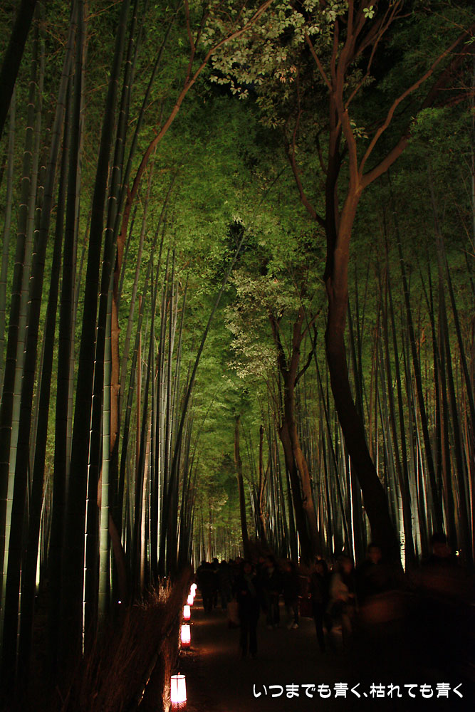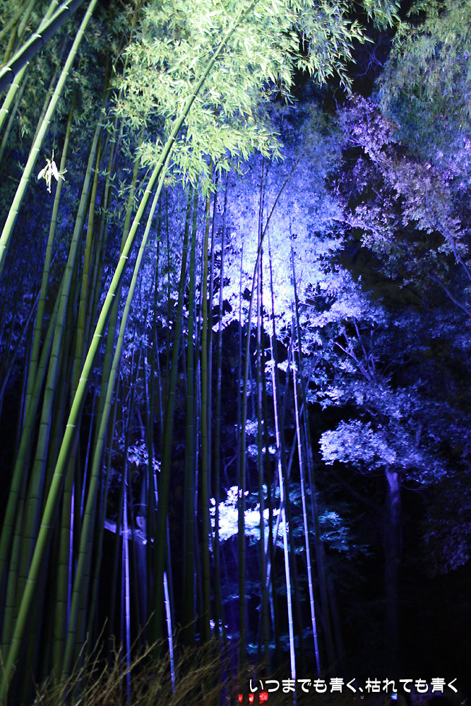 この竹林の小径のライトアップは、とても幻想的ですばらしい光景です。通常のライトの中に青いライトが混じってそれがまた不思議な世界を醸し出しています。この光景は一見の価値あり。来てよかったと思いました。