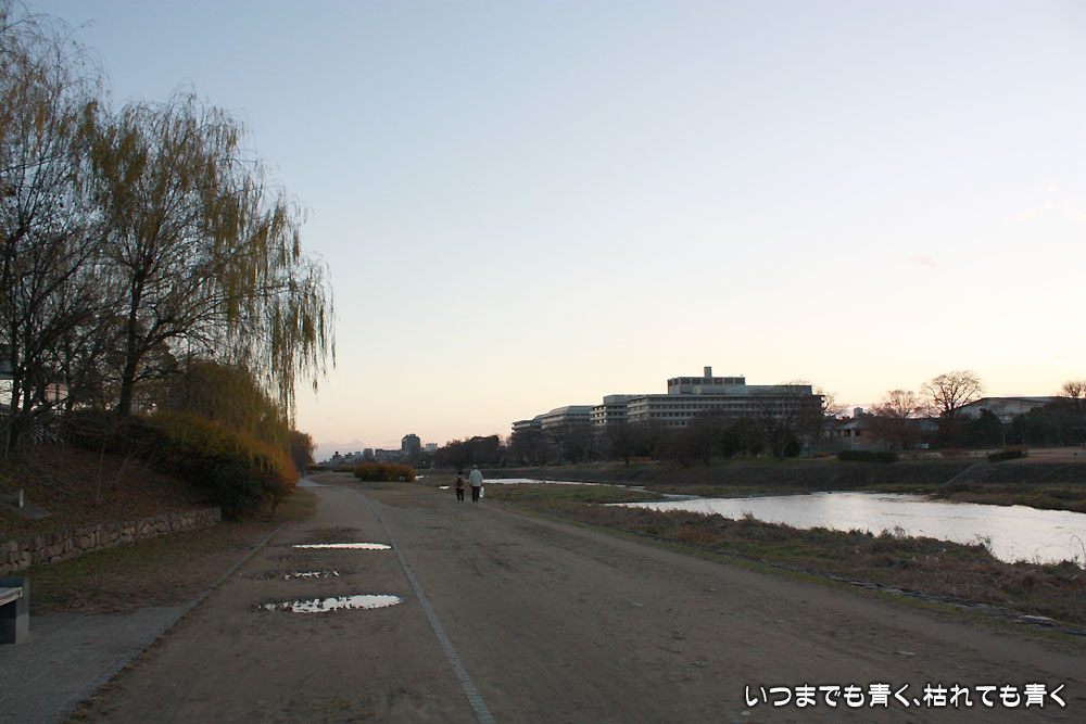 少しさみしい夕暮れの鴨川べりをしばらく歩いて京都に別れを告げます。