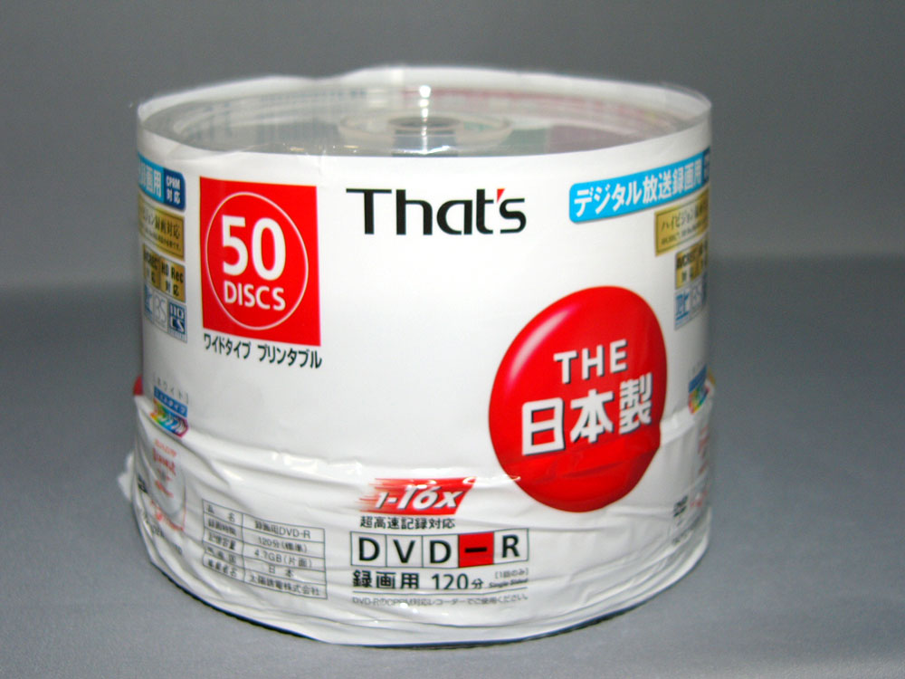 私は、DVD-RとかCD-Rとかのメディアを買うときは、多少高くても日本製、その中でも「That’s」ブランドの太陽誘電製品をずっと愛用しています。
