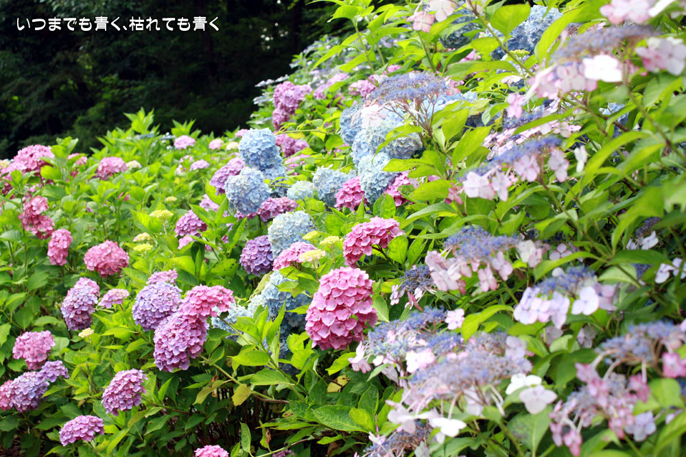 まだ紫陽花の見ごろの時期ではあるのですが、ここのところ雨が降っていないので元気が感じられず、6月末ということで中にはくたびれかけはじめている花も出始めています。色と種類はバラエティに富んで花自体はいろいろと楽しめますが、ちょっとまとまりの無い咲き方で、「あじさいの道」というには少し情緒が足りない気がします。私の紫陽花のイメージは、細い舗道にこれでもかとばかりにせまって咲き誇るというものを持っています。ここは、クルマの走る道の脇の広い野に紫陽花がまとまって咲いているという状況で、私のイメージとはかなり異なります。なので、なかなか写真の良い構図を見つけることができませんでした。