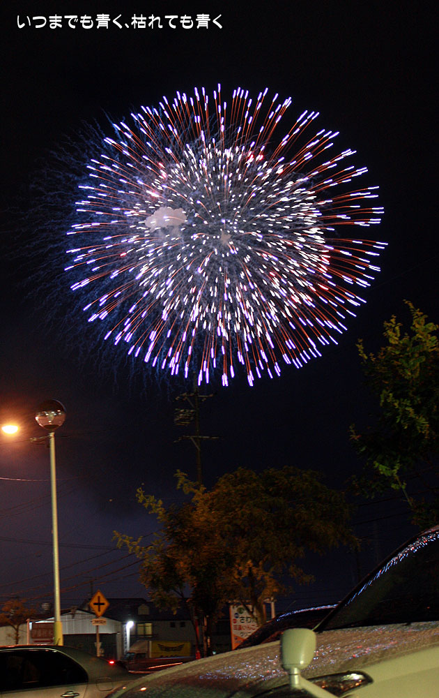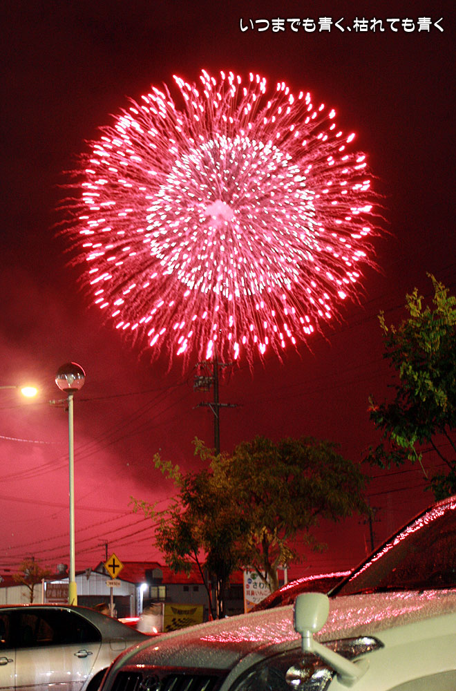 ショッピングセンターで雨宿りを余儀なくされましたが、ほどなく雨は上がり中止にはならず予定より少し遅れての開始となりました。しかし、いつまた雨が降り出すかわからない状況のため、今回は場所をショッピングセンターの駐車場に変更しての車からの花火見物でした。大音響を浴びる快感は味わえなかったものの、季節を感じる花火は堪能できました。