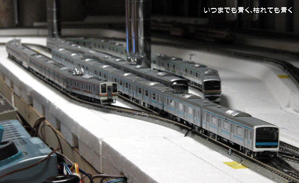 211系、209系、E217系、E231系の8輌編成が並び、走らせてすれ違いの風景などを眺めているとなにもないレイアウトでありながら時間を忘れてしまうほど楽しいです。