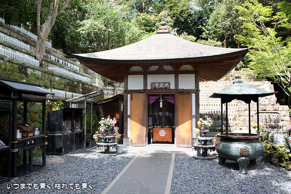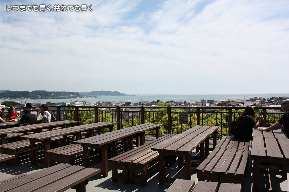 観音堂を出て海の方に歩くと見晴台があります。聞いていた以上にすばらしい眺望です。正面全体に相模湾が広がり、左手に三浦半島が伸びているのが見えます。海の上にはウインドサーフィンを楽しむ人たちが数多く見えます。見晴台の椅子に座ってその景色を眺めているだけで心が落ち着きますし、日々のいろんな些細な事がどうでもいいような落ち着いた心になります。