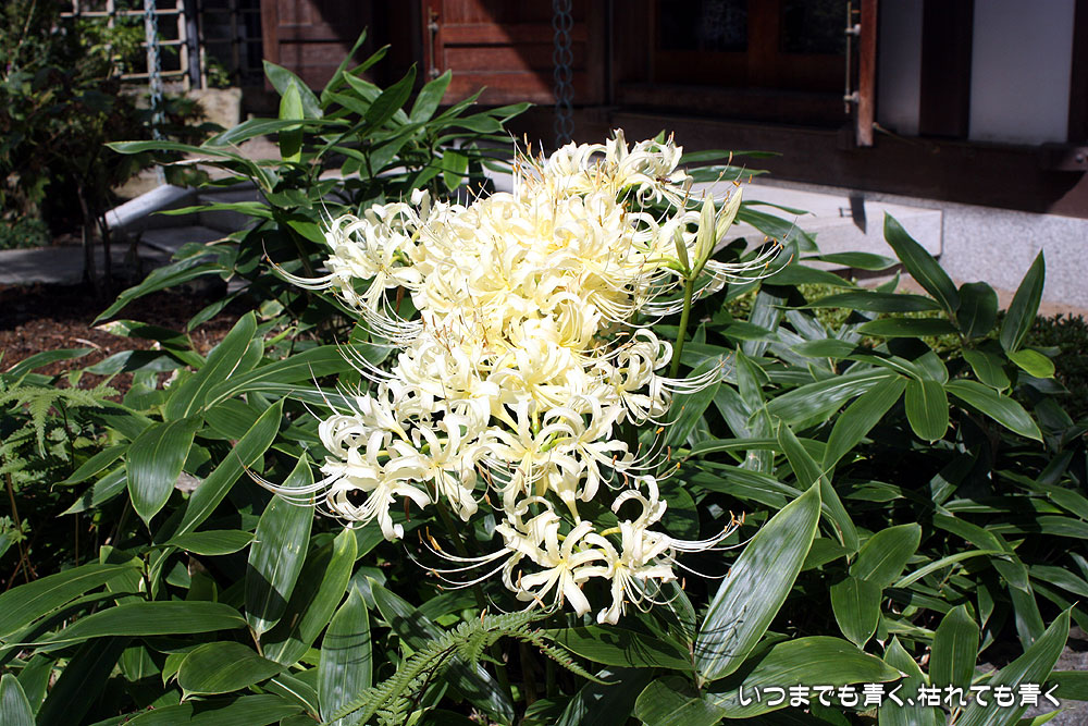 地蔵堂のところまで戻り、今度は弁天堂のほうに向かいます。そこには弁天窟という洞窟があり、内壁面には弁財天とその眷属である十六童子が彫られています。洞窟は狭くて天井が低いところもあり、子供の頃の探検隊気分を思い出します。弁天窟を出て放生池の前を歩いていると、白い彼岸花。思わずレンズを向けてしまいました。