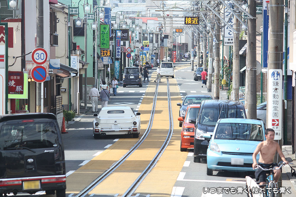 長谷観音で穏やかな時間を楽しんだあとは、藤沢まで江ノ電で移動です。藤沢へ向かう江ノ電の中では、運転席の後に陣取って写真撮影です。腰越、江ノ島間の車道との併用区間では、電車が近づく時の雰囲気が良く出た写真を撮ることができました。