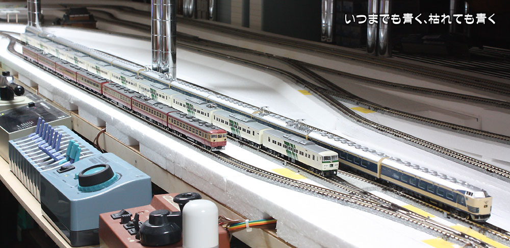 写真は、現在走らせて動力車の調子を確認している、583系「明星」12輌編成、185系「踊り子」10輌編成(試走なので連結順番はいいかげん)、475系「立山」7輌編成です。