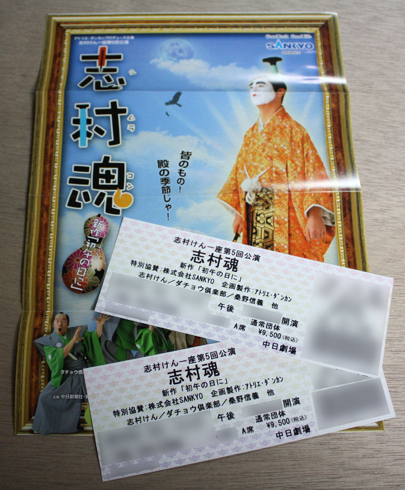 志村魂! 日記/出来事 2010年7月7日(水) 21:01 七夕の日に・・・ 申し込んでいた志村魂のチケットが届きました。 勤務先の親睦団体の観劇会の申し込み抽選で当たりました。 A席2枚、会費による補助があって、なんと2枚で2,500円です。 嬉しいですね。 生で初めて、私の大好きな志村けんを楽しんでくることにします。