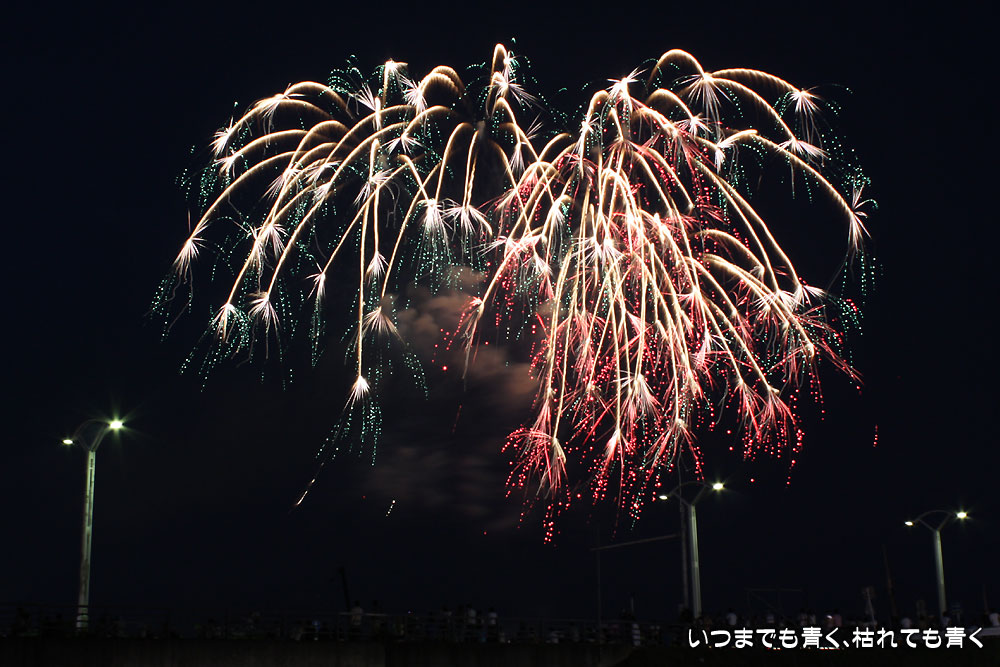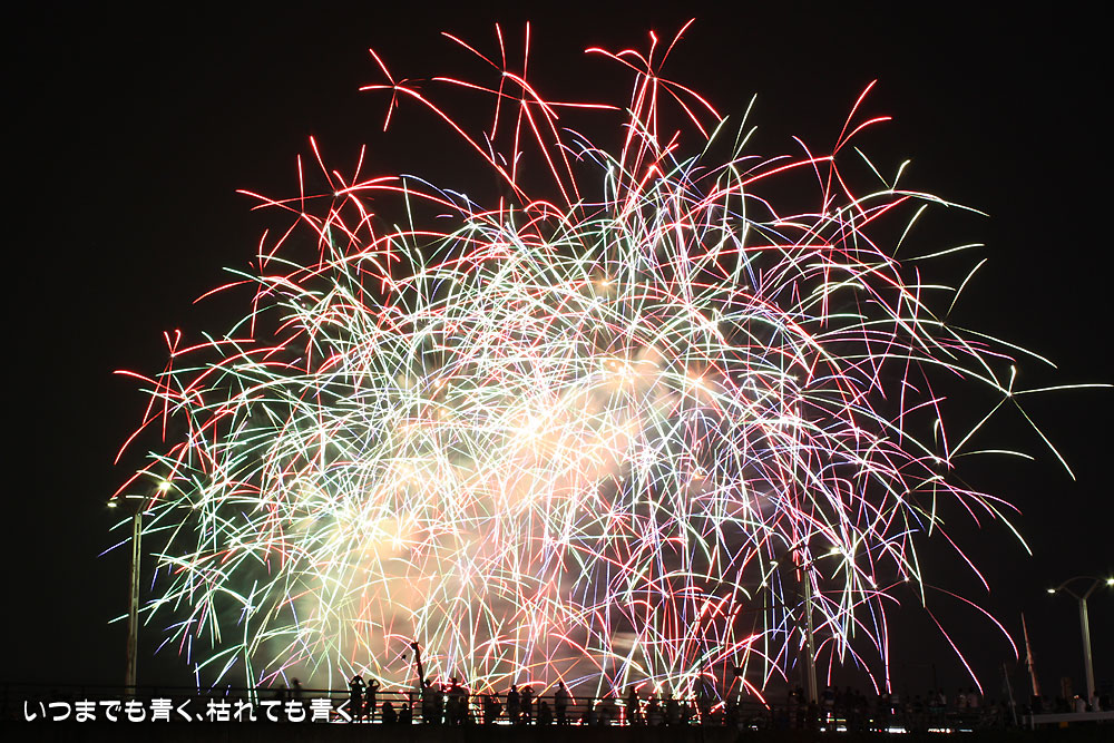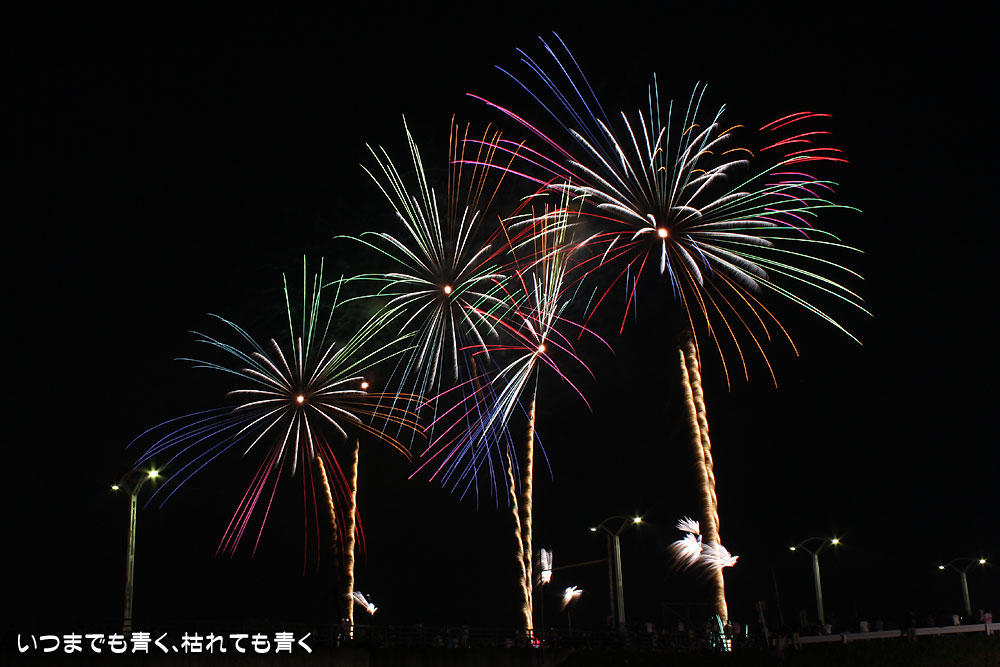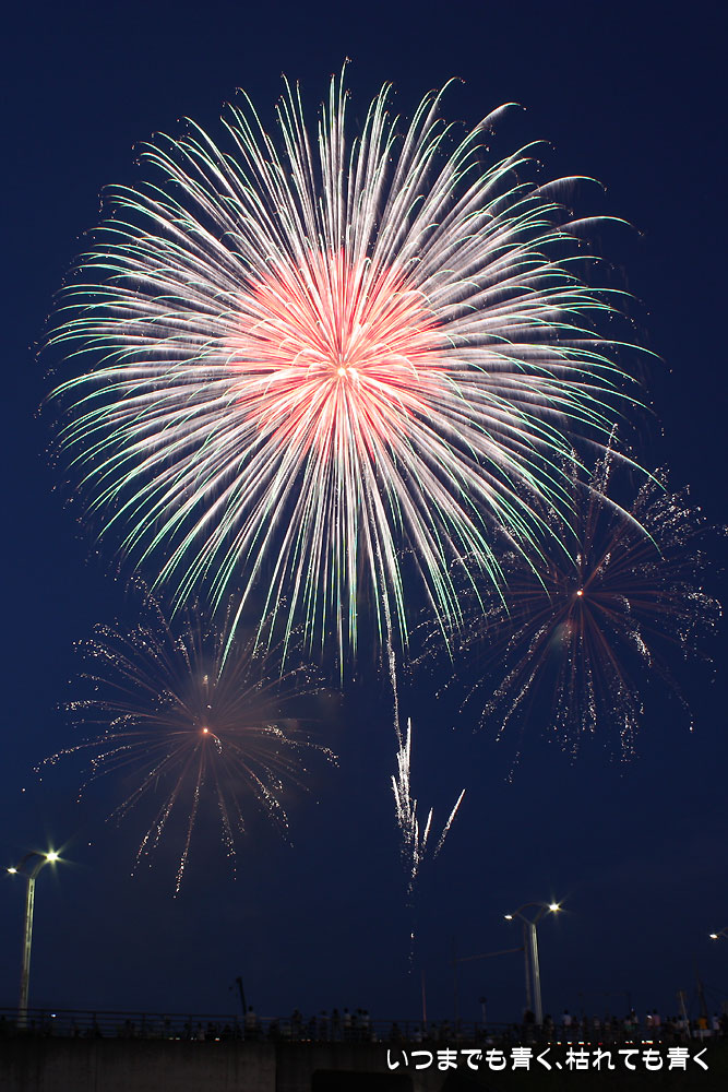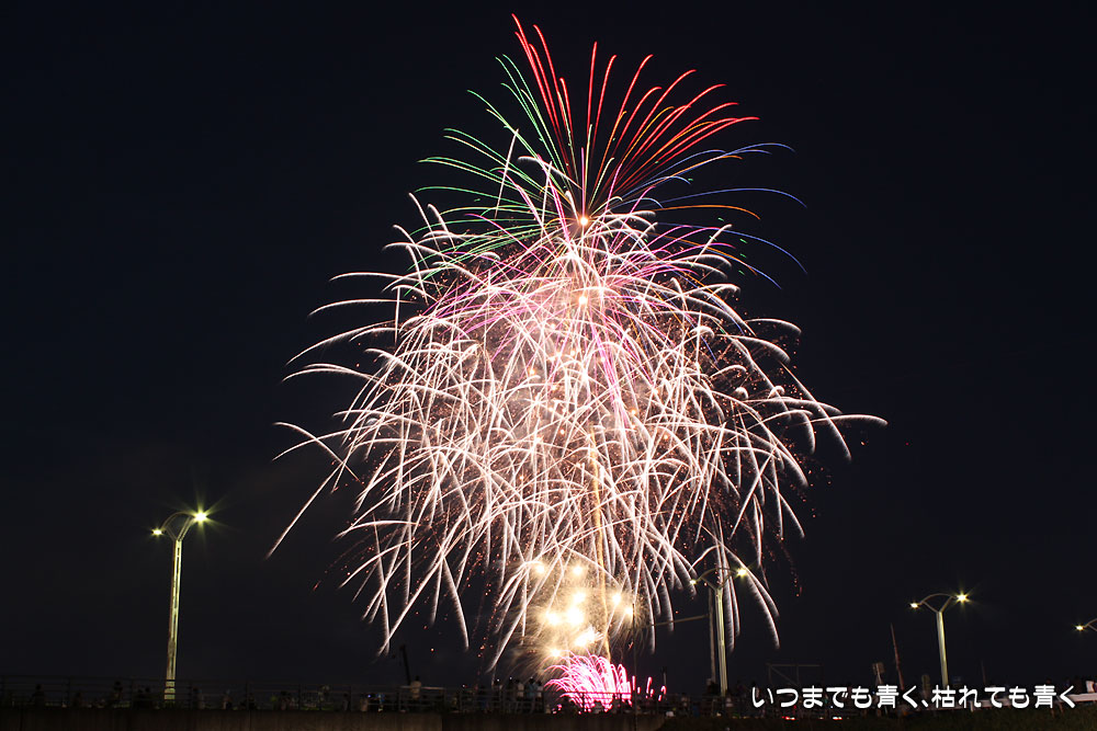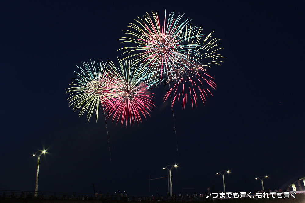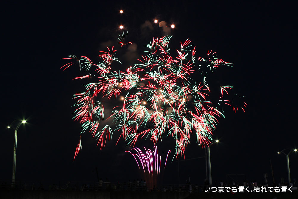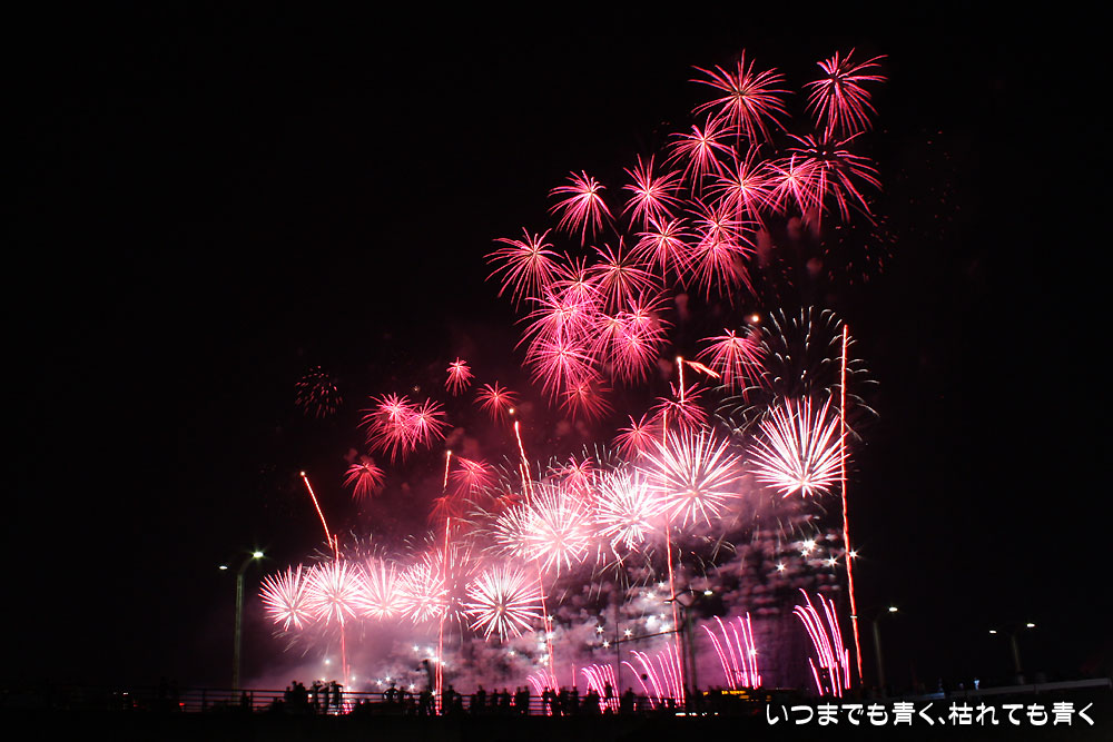 そういう話と矛盾することなのですが、こうした方法で撮影した写真の花火は、直接見た花火と違うことは別の意味で悩ましいところではあります。例えば、目で見た時はハートの形で広がる花火が、この撮影方法だとハートの形ではとらえることができません。ハートで残したいのならば、その瞬間をとらえる必要がありますので、それならば携帯カメラなどで撮影したほうが、よほど実際に見た花火の思い出になると思うわけです。