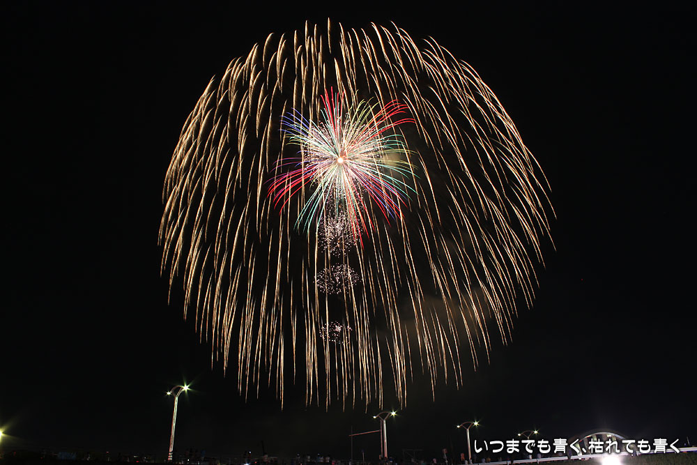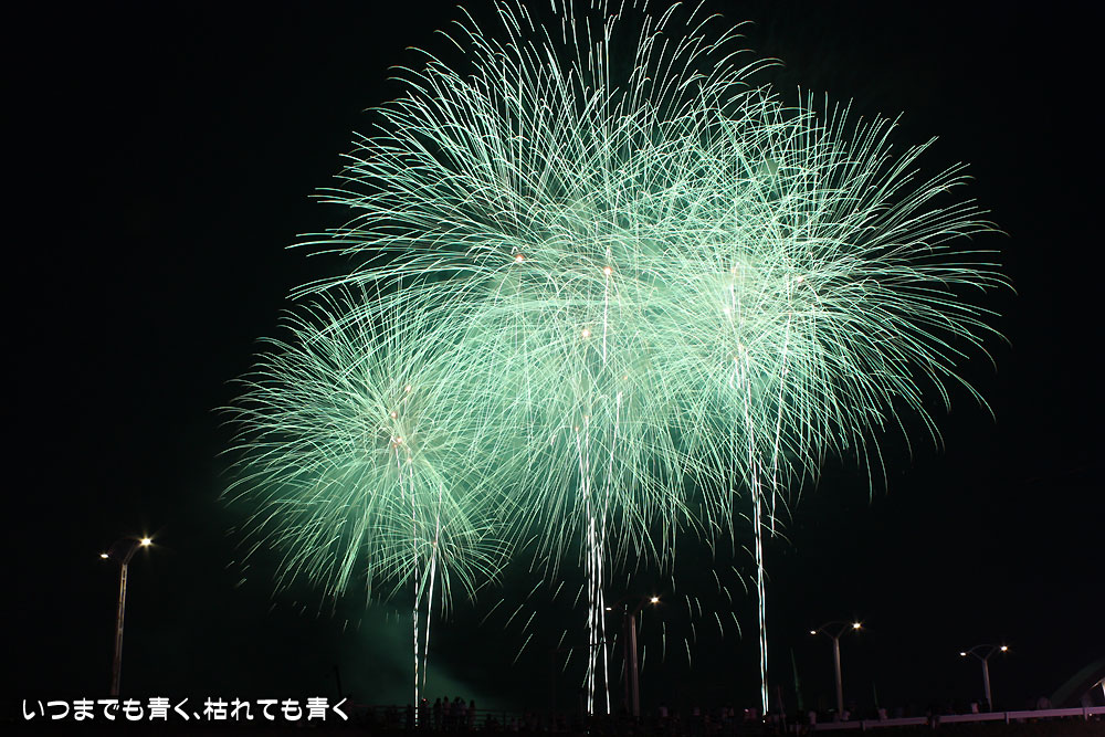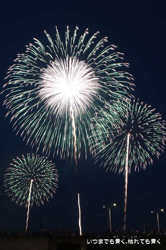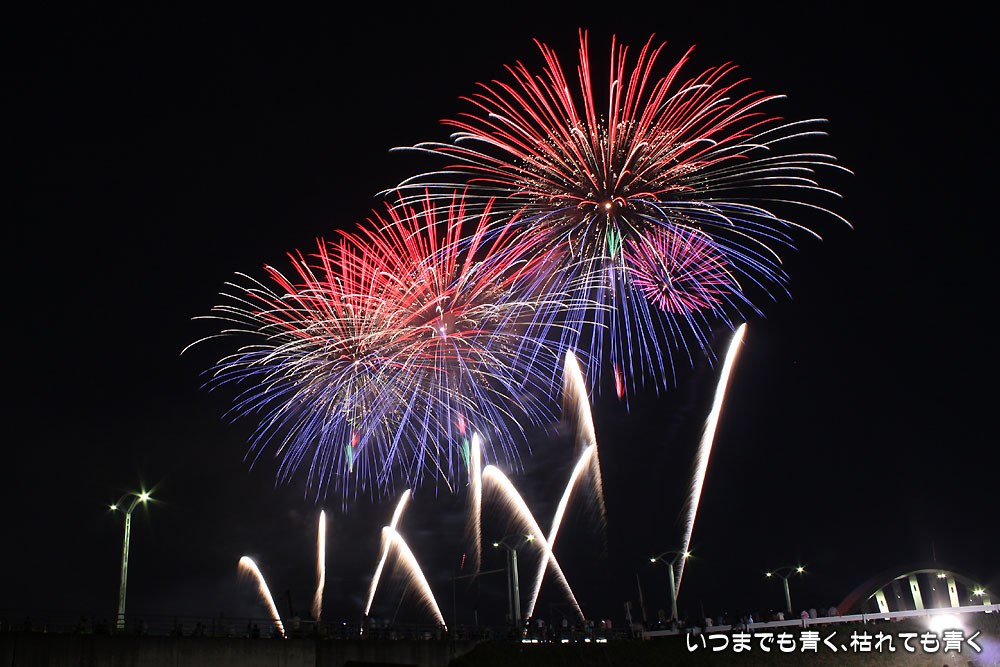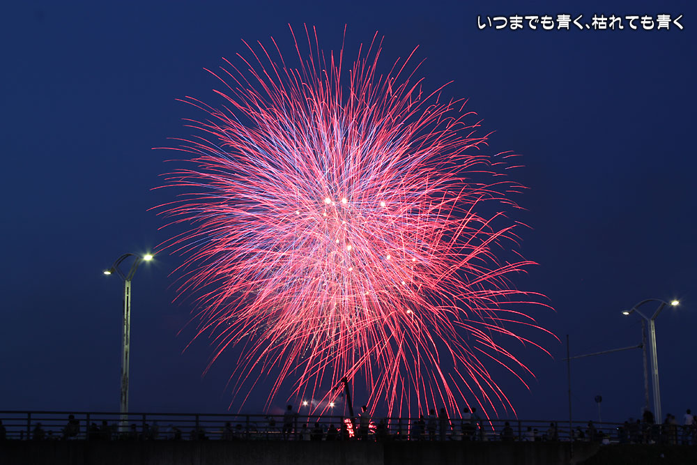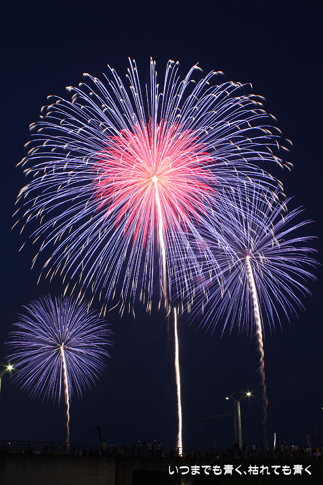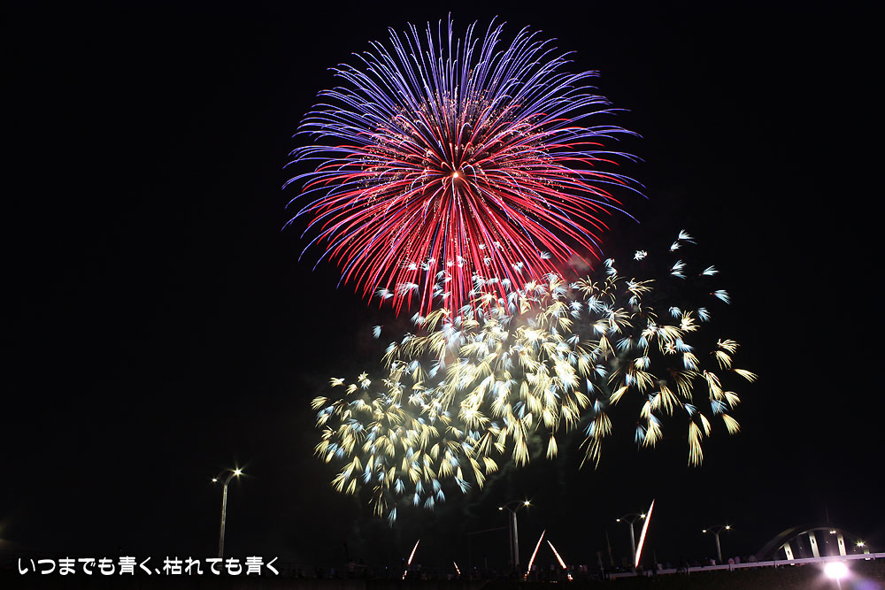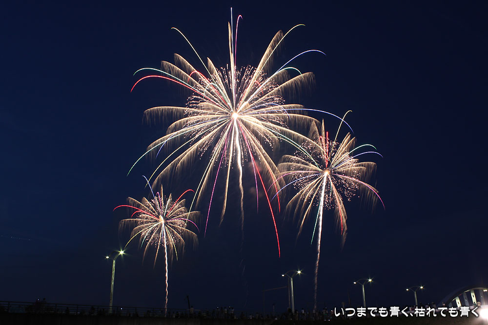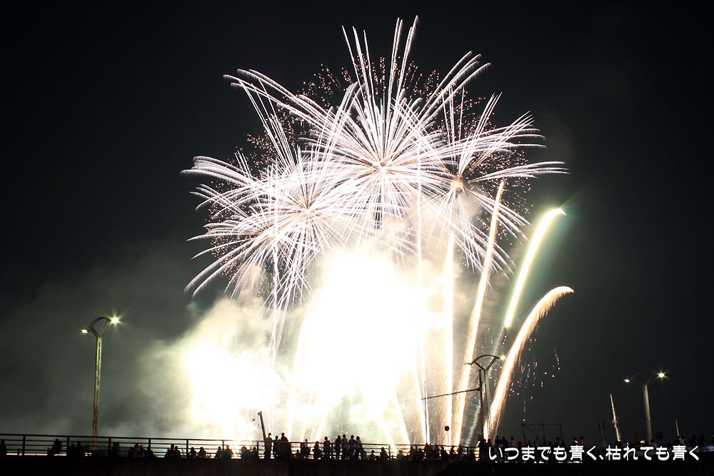 そういう話と矛盾することなのですが、こうした方法で撮影した写真の花火は、直接見た花火と違うことは別の意味で悩ましいところではあります。例えば、目で見た時はハートの形で広がる花火が、この撮影方法だとハートの形ではとらえることができません。ハートで残したいのならば、その瞬間をとらえる必要がありますので、それならば携帯カメラなどで撮影したほうが、よほど実際に見た花火の思い出になると思うわけです。