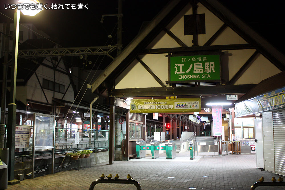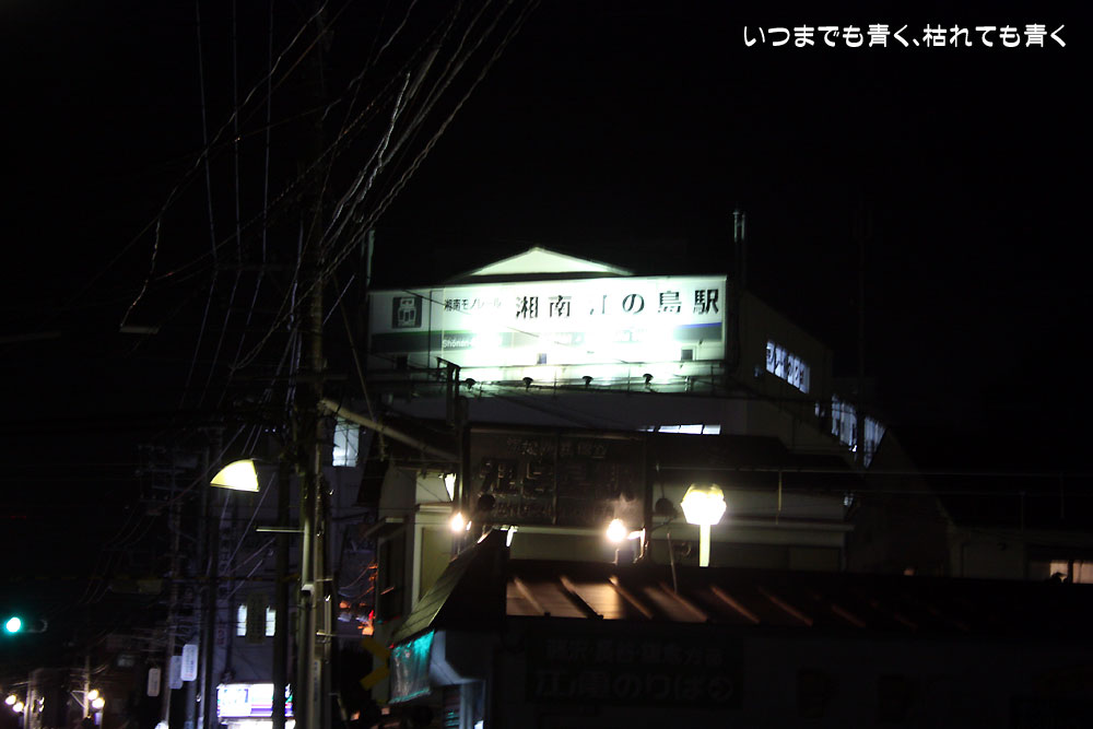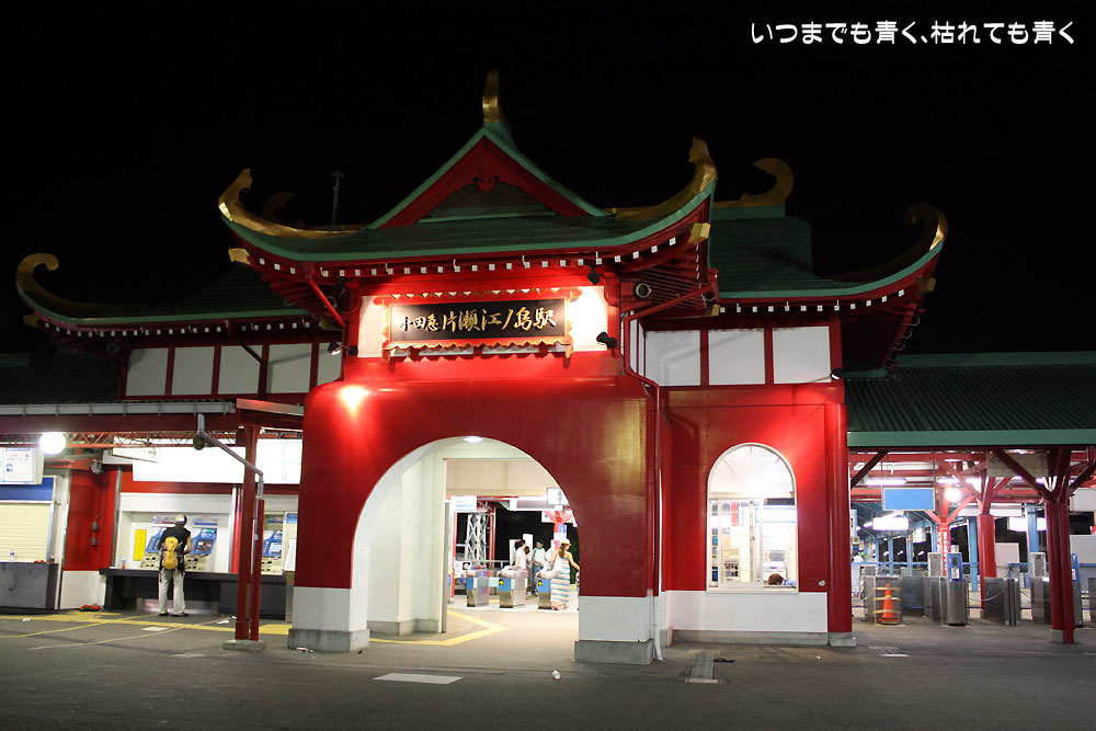 | 夜の竜宮城を見たくて、茅ヶ崎からの帰り道に藤沢から小田急に乗って片瀬江ノ島駅へ寄り道しました。帰りは江ノ電の江ノ島駅を横目に通り過ぎて、湘南モノレールで帰路につきました。 | ![]() 小田急「片瀬江ノ島」駅 |
