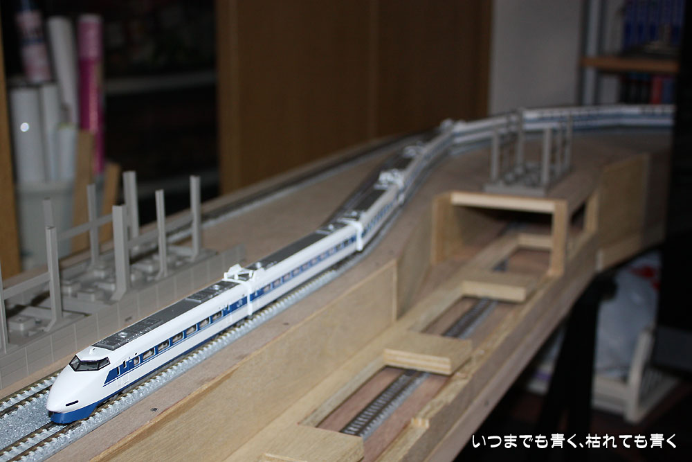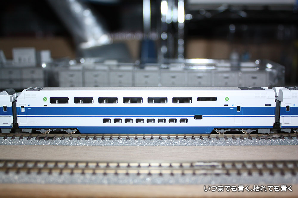 久しぶりに出して中をみたら走らせてみたくなりました。走らせるのは、購入以来初めてのような気がします。長大レイアウトで走らせると様になります。カッコいいです。見ほれて車輌を眺めていたらおかしなことに気づきました。7号車の形式の車番がありません。ドアのステップの銀もありません。きっと最初からの不良品だったようです。きちんとチェックもしていなかったのですねぇ。