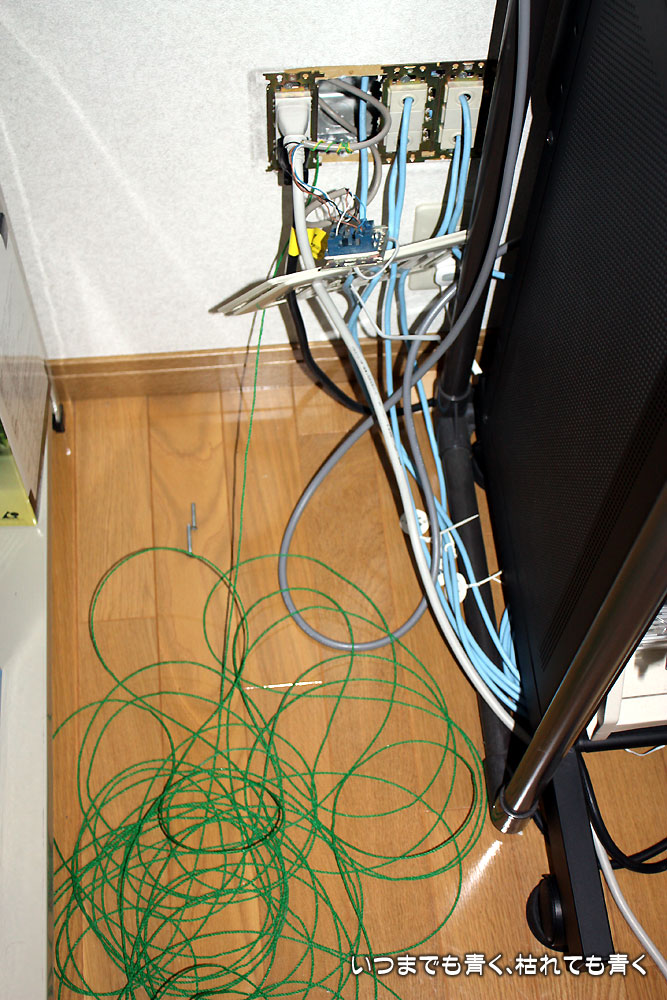 電話線は私の部屋に一度引き込んでから、必要な部屋に配線してあるので、何も問題なし。工事に備えて、外から私の部屋への電話線の配管に光ケーブルを通すための導線を入れておいてくれました。