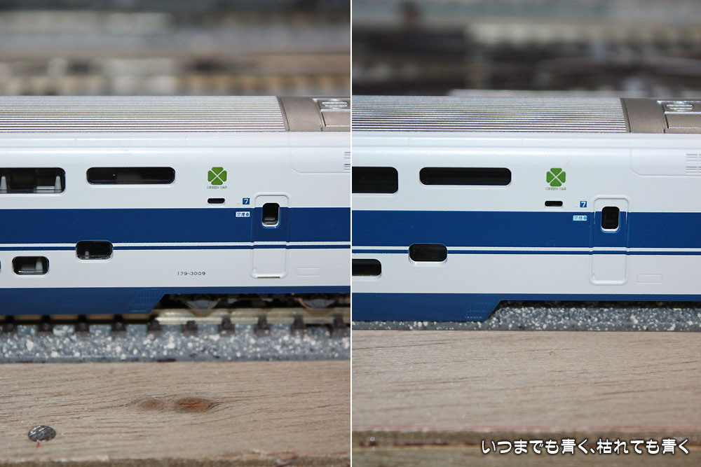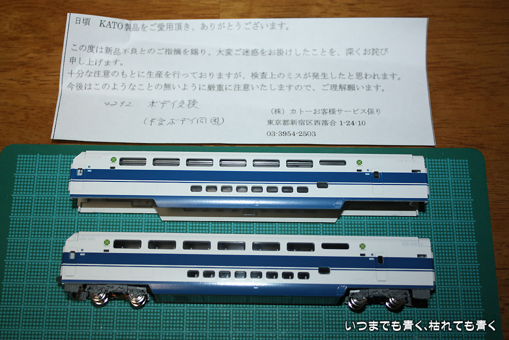 100系新幹線「グランドひかり」で書いたように、KATOの100系新幹線「グランドひかり」の7号車の車番とステップが印刷されていないということで、KATOサービスセンター修理係に送った7号車が本日戻ってきました。日曜日の夜に送ったのがもう届きましたので、先回に続き非常に迅速に対応していただきました。しかも、ロット違いでの色あいが気になりましたので、不良ボディもできれば返送してもらえるようにお願いしたら、ちゃんと同梱していただけましたよ。修理完了の文面は印刷の定形文で味気ないですが、対応は良心的で安心できます。やっぱり車輌はKATOですね!ちなみに、色合いはまったく違いがわからないので、全然問題ありません。(下の写真は、色合いが異なるように見えますが、これは写真撮影による違いです。)