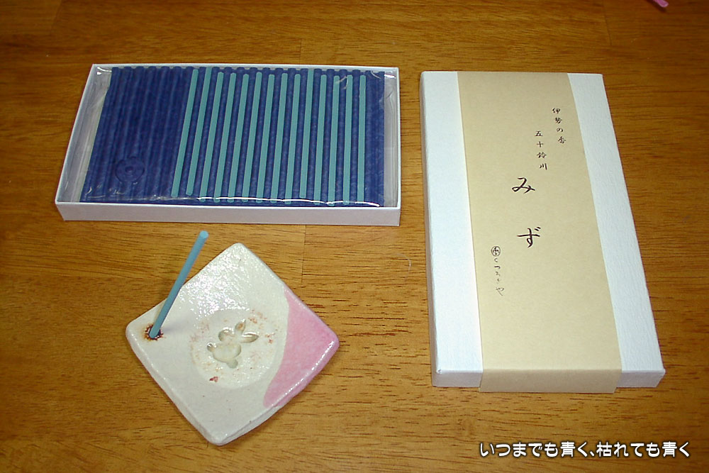 さらに精神を落ち着かせるために、昨日、伊勢おはらい町にある香の「くつろぎや」さんで買った香を焚いてみます。今回買ったのは、「五十鈴川・みず」という30本入りで1,260円のお香です。