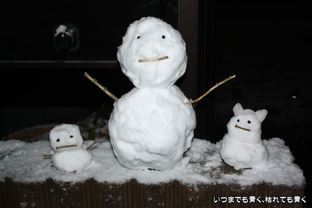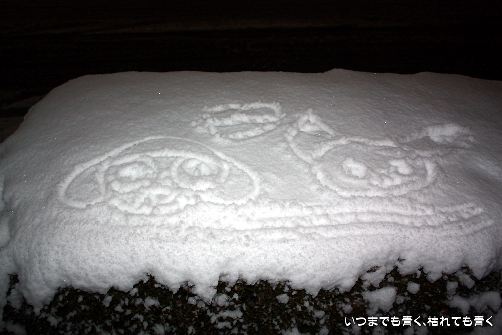 雪景色 日記/出来事 2011年1月16日(日) 23:07 今日は午後から雪景色です。 末娘と雪だるまを作ったり、夜に娘たちに誘われて一面真っ白な道路や公園を散歩。 キュッキュッと音がする雪を踏みしめての散歩は、時間を忘れてしまうほど楽しいです。 雪の影響は各地でいろいろと大変ですが、こういう時間を持てた事は私はちょっと幸せ、だったかな。 雪だるま(両側が末娘作、中央は私作) ゴールドクレストに積もった雪 歩道の植木の雪 植木の雪の上に描いたケロロとピカチュウ
