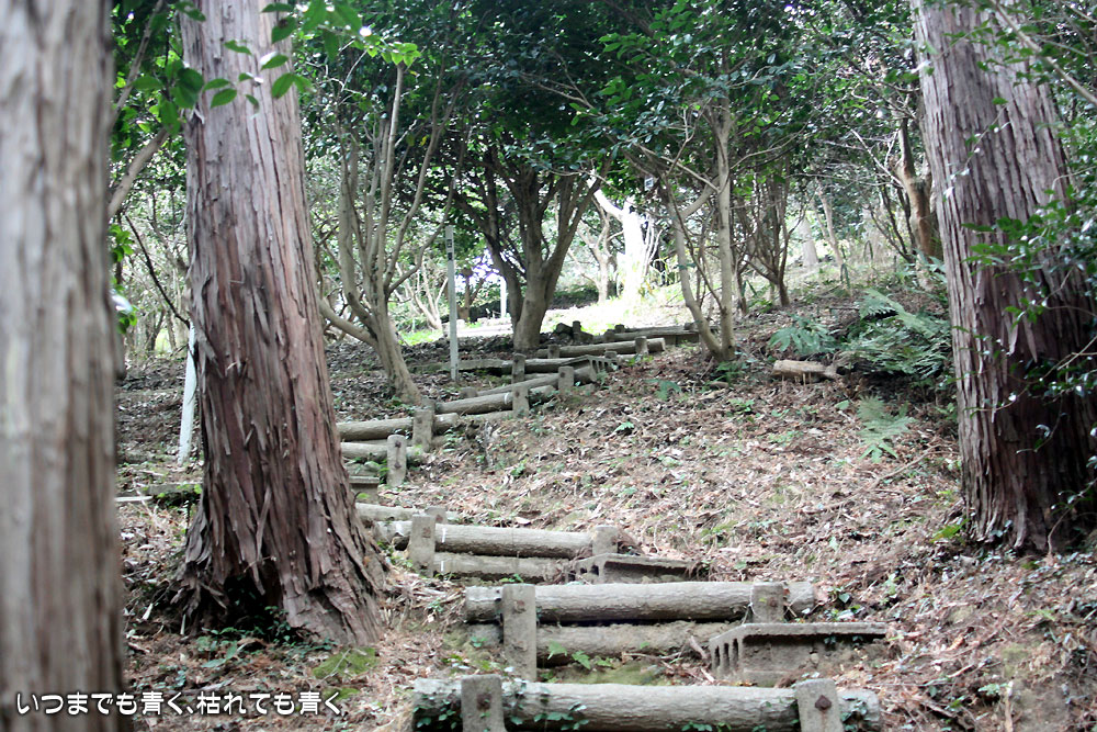 椿園は、本堂裏手の山の急な斜面にあります。150種、750本の椿が植えられており、斜面の途中にコンクリートで歩道が作られていますが、狭いし途中で割れていたりしていますので、脚を踏み外さないように注意が必要です。一番上には展望台もありますが、木々が邪魔であまり見晴らしは良くありませんでした。