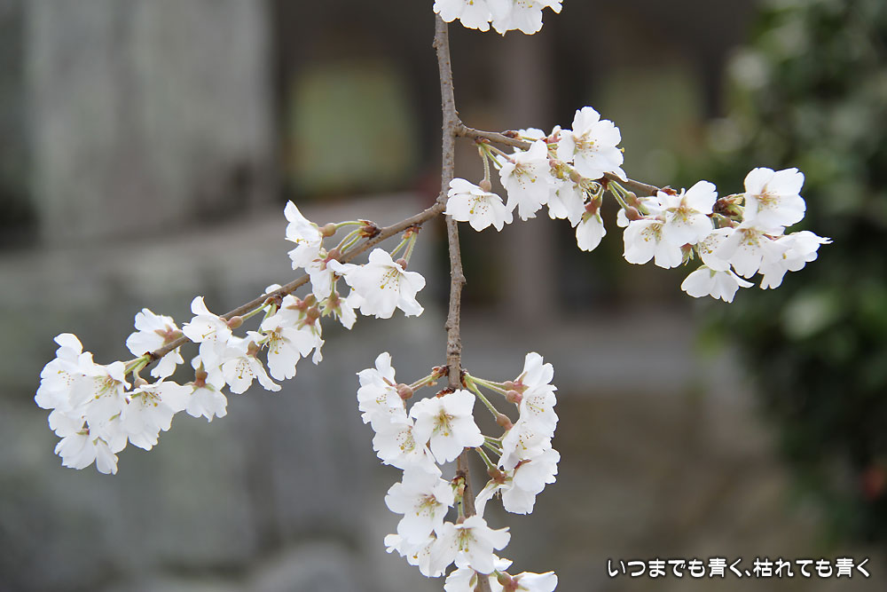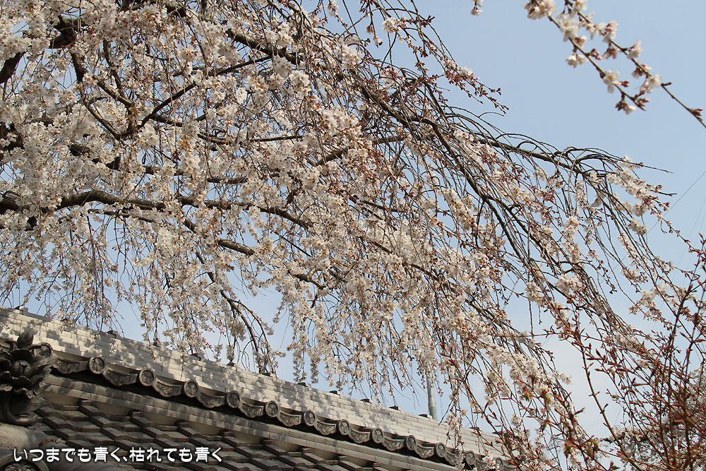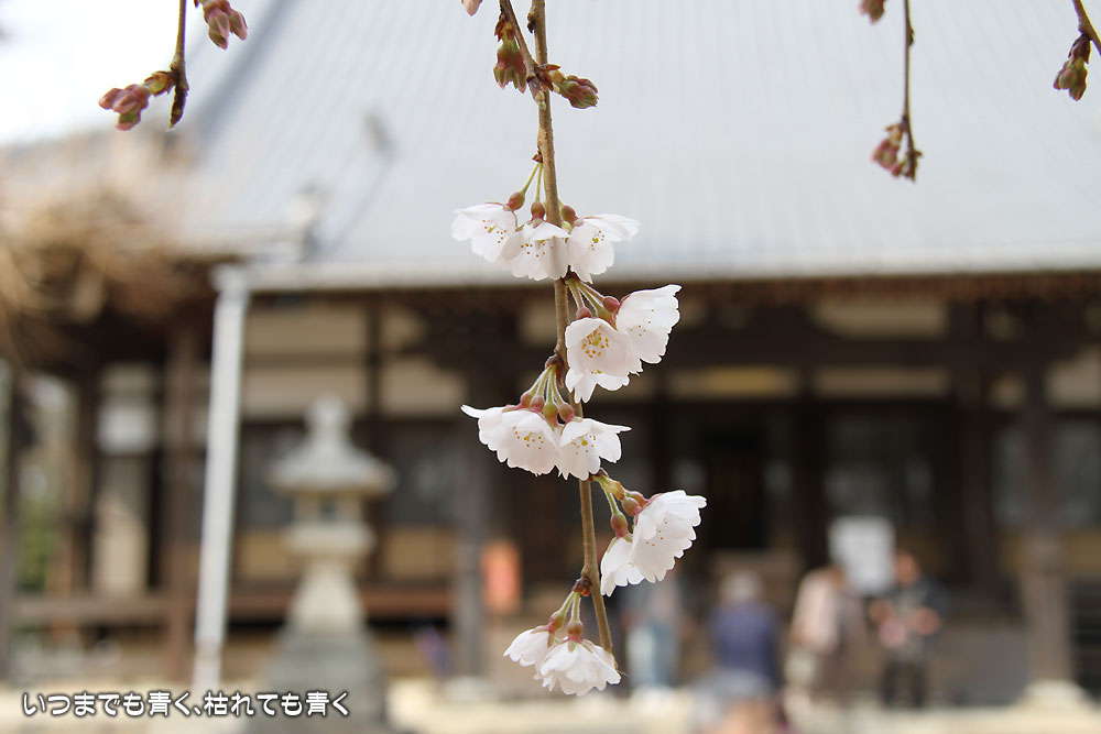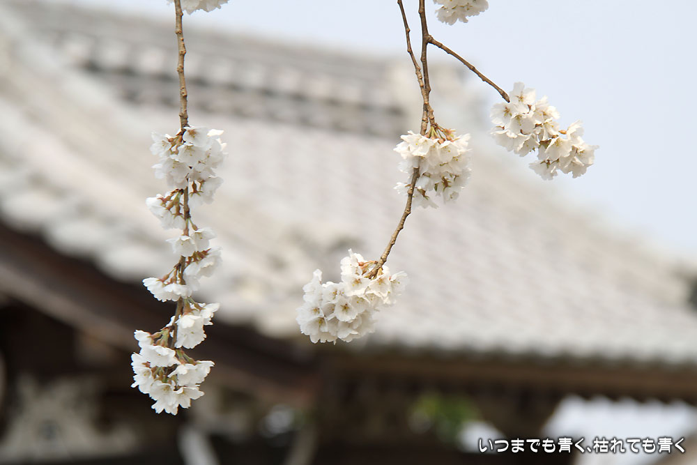 枝垂れ桜はちょうど見ごろで見事です。白くてしっかりとしたたくさんの花が、上から見事に垂れています。それほど広くない境内なのにとても開放感を感じますし、落ち着いた気持ちになります。枝垂れ桜だけではなく、本堂の裏手や脇の高台にはいろんな花が植えられていて、プチ散策を楽しめます。高台から眺める枝垂れ桜は壮観でしたね。