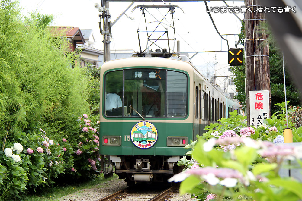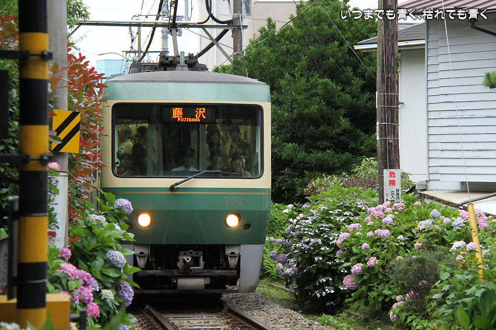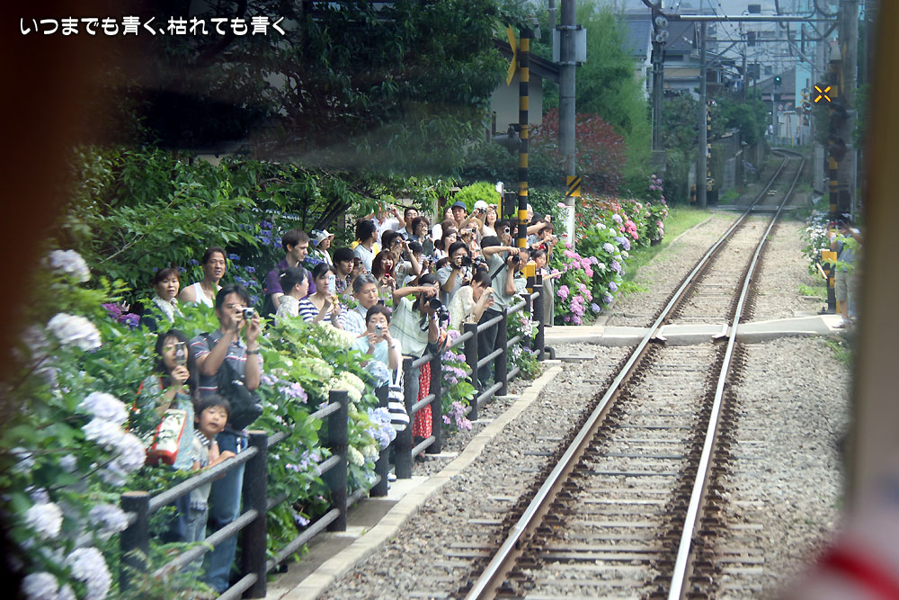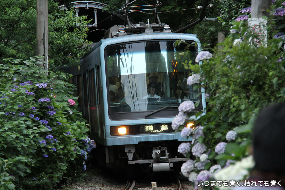 紫陽花をきちんと入れて、人を写すことなく江ノ電を撮影するのは至難の業です。