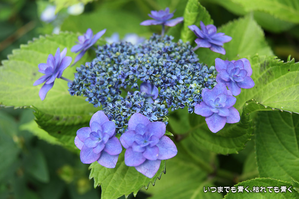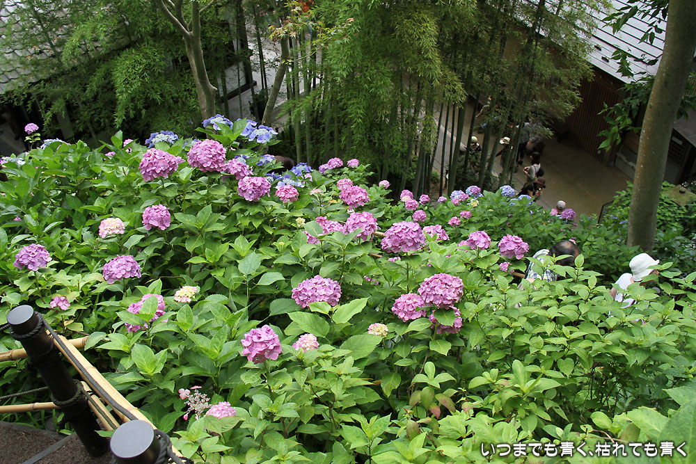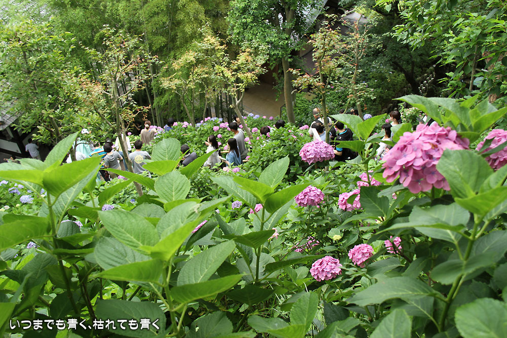 成就院でも感じましたが、たくさんの紫陽花が美しい景色の中に咲いている姿は、スケールを感じる雄大な美しさを感じますね。しかし、その雄大さを写真に残すのは本当に難しいです。上下左右に大きく広がる景色も、カメラの中におさめるとこじんまりした狭い風景になってしまうんですよね。写真撮影の腕がないのか、写真の限界なのか、どちらにしても残念です。