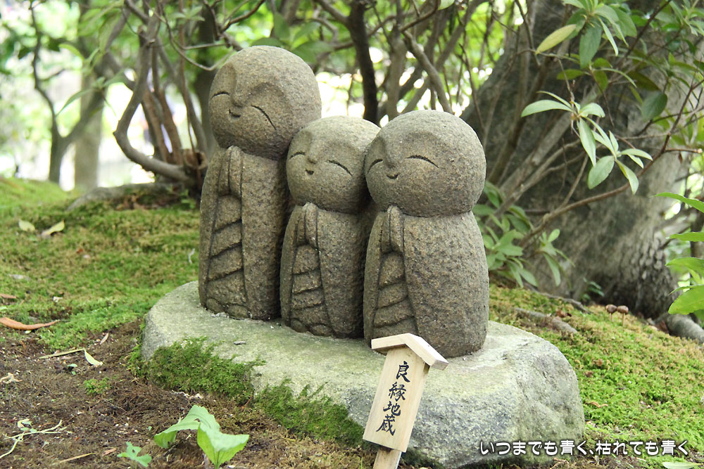 「鎌倉ぶらりひとり旅 ~和み地蔵のリーダーを探せ!~」以来の再開となる和み地蔵たち。人と同じ大きさの和み地蔵は、消えかかっていた文字もきれいになって穏やかに笑っていました。小さな3体の仲睦ましい和み地蔵たちも、それぞれの場所で訪れたひとたちに和みを与えていました。あらたに「良縁地蔵」という札が立てられていて、この和み地蔵たちは良縁地蔵というのが、正式な名前なのかもしれません。長谷寺は、この和み地蔵たちに会うだけにでも、行く価値があると私は思っています。本当に和やかないい表情です。