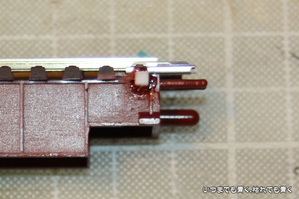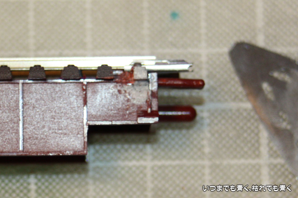 TOMIXデッキガーター橋の架線柱取付口除去跡の枕木空洞部分につけたプラ角材ですが、他の枕木にくらべると縦方向に大きいので、模型ソーで切り取って高さをあわせます。