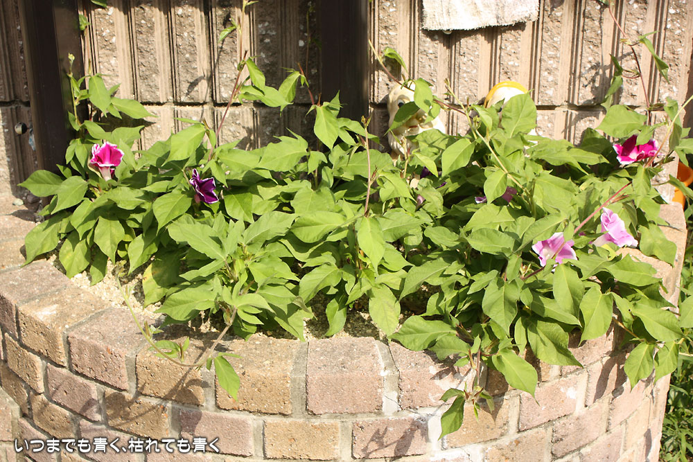 一週間ほどで芽が出て、葉がだんだんとふえていき、今朝、ようやく朝顔の花が咲きました。