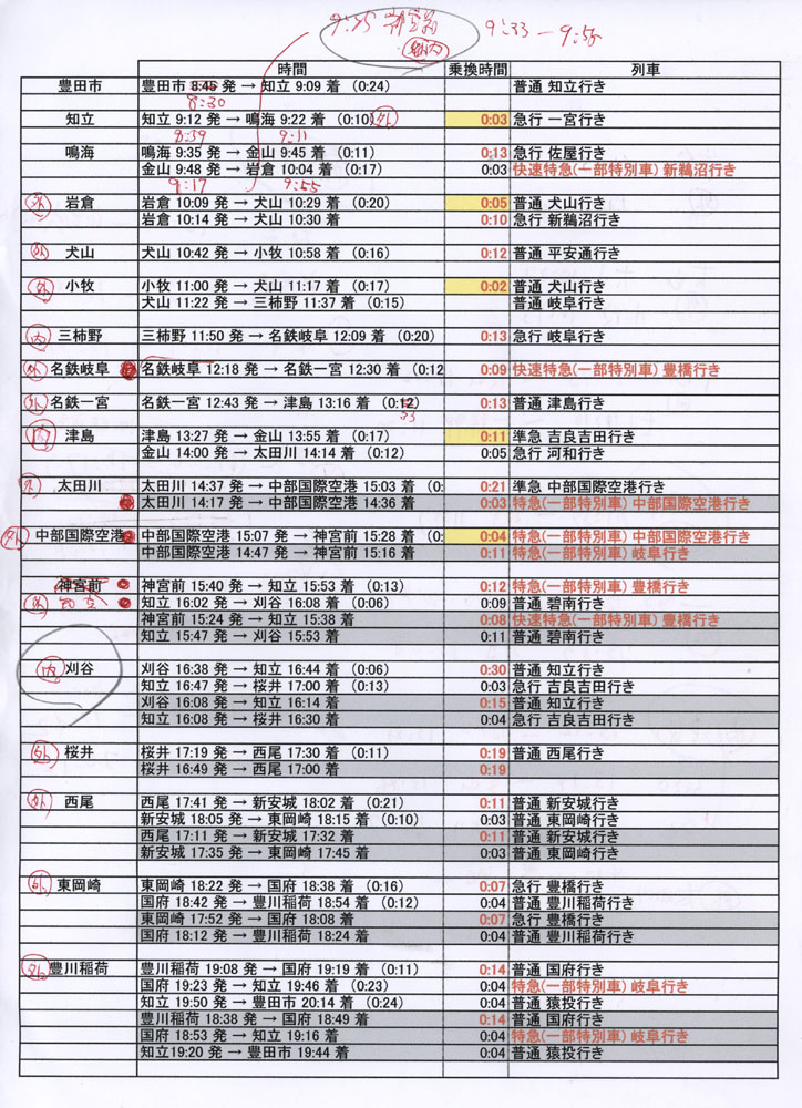 そういう目標で、昨夜は名鉄ホームページのダイヤ検索機能を駆使し、最初からどの順番でどの電車に乗るかをきっちりと決めました。もちろん、スタンプを押す時間によっては次の電車に乗れないケースもありますので、いくつかのケースも決めて、最後まで乗る電車の候補を決めておきました。