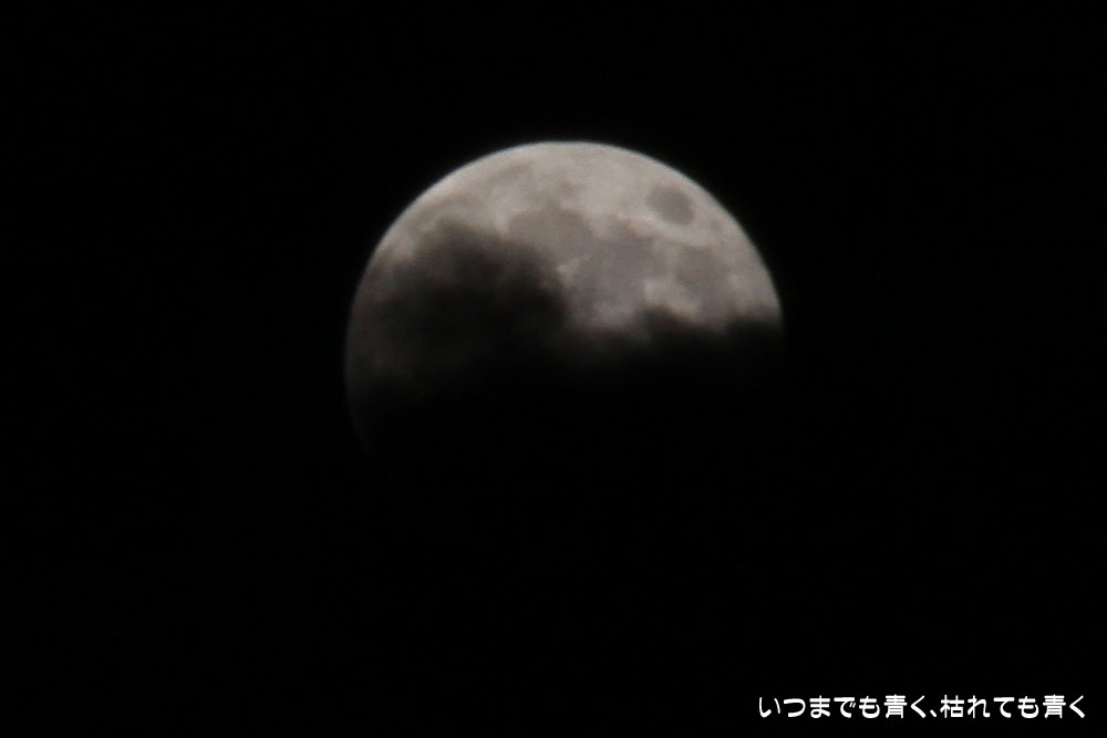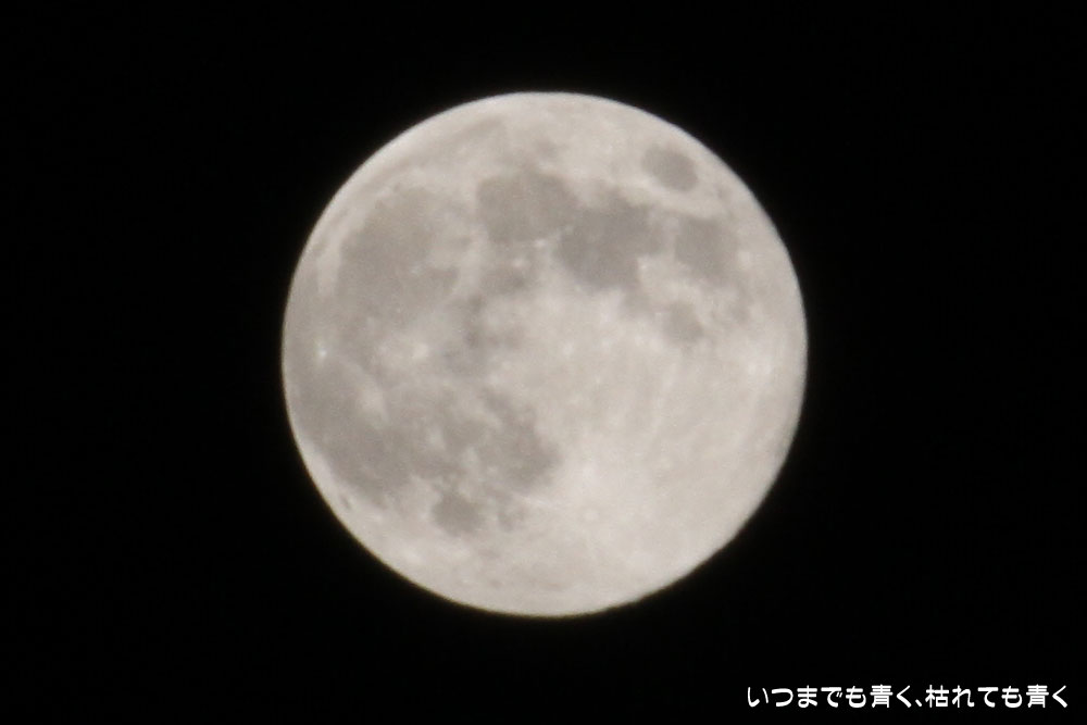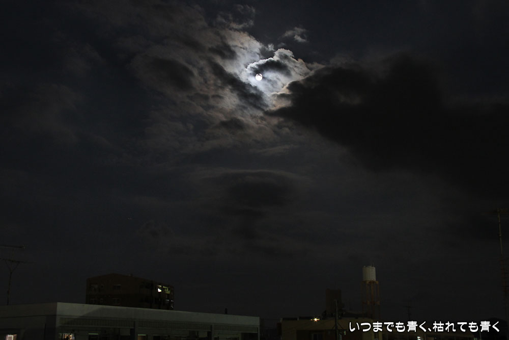 ![]() 雲がかかり始めてしまいました 【1秒 F8 ISO:1000 19時26分】 | ![]() 雲間の満月 【1/25秒 F36 ISO:400 19時23分】 |