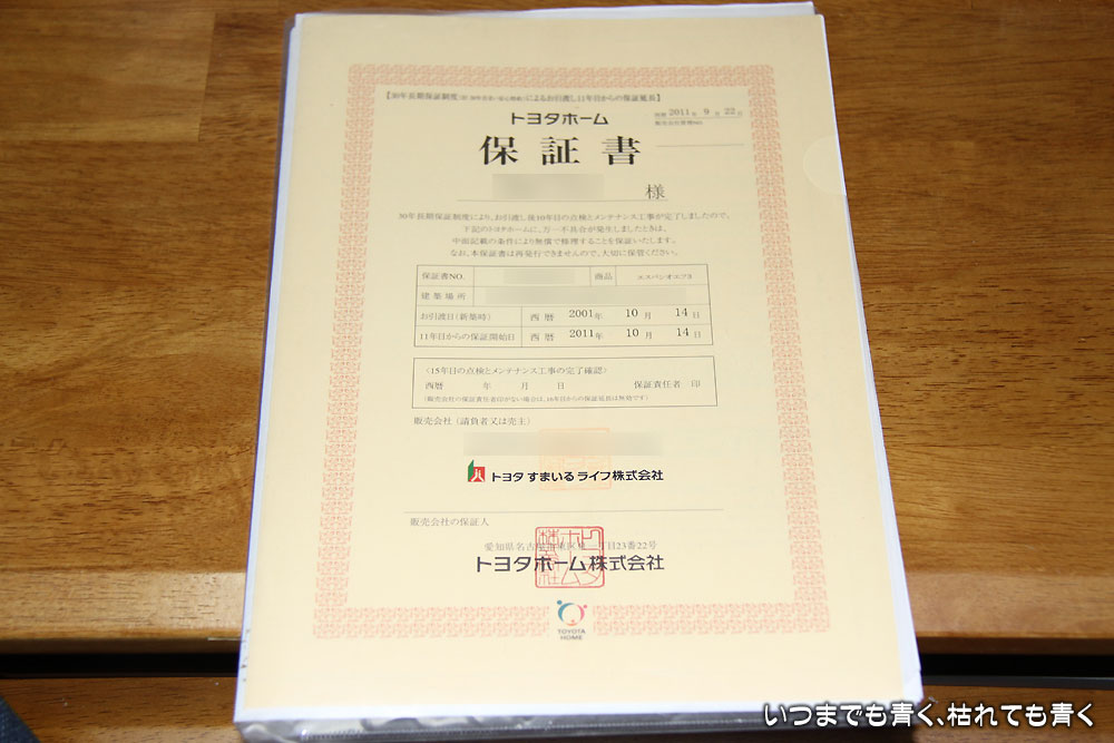 そして、銀行での月末の用件をすませた後、約束していた住宅会社さんとの打ち合わせです。先々週に防水シートの補修工事をしてもらいましたので、これからの10年の延長保証書の説明と受取りです。きちんとメインテナンスをしていれば、30年長期保証されますので、ありがたいですね。この保証期間内であれば、雨漏れはいつまでも無償で対応していただけます。まぁ、雨漏れなんかしちゃ困りますけどね。以前の家が12年であきらかに傷みやくたびれ感が出てきたのに比べ、今の家はまだ新築気分。作りのしっかり度合いが違うのが大きいですね。