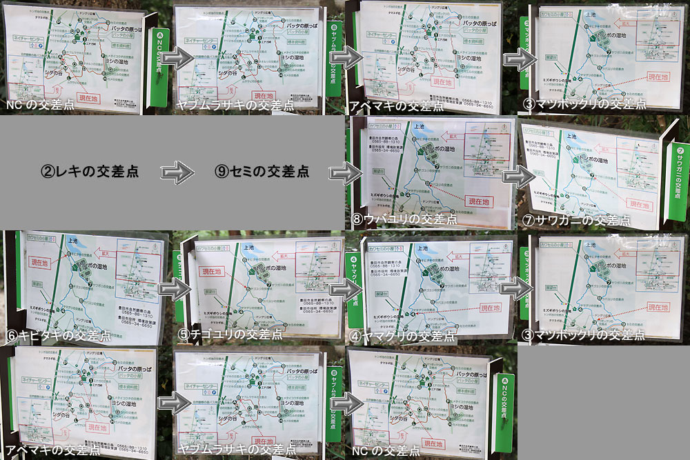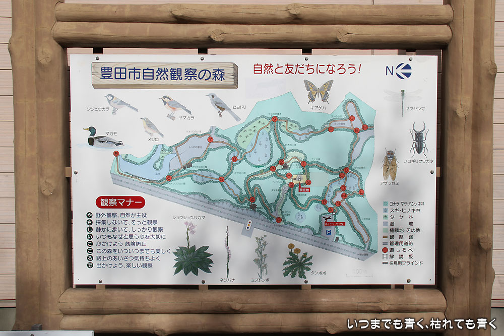 森に入るにはネイチャーセンターという建物を通る必要があって、その中に入ると女性の職員の方が気さくに声をかけてくれて、森の中の地図を広げて説明してくれます。いろいろ散策コースがあるようで、トンボの湿地ルートだと2.3Kmで約70分、ムササビの森ルートだと1.8Kmで約45分、寺部池ルートだと2.1Kmで約60分、外周ルートだと4.7Kmで約120分とパンフレットに書かれています。
