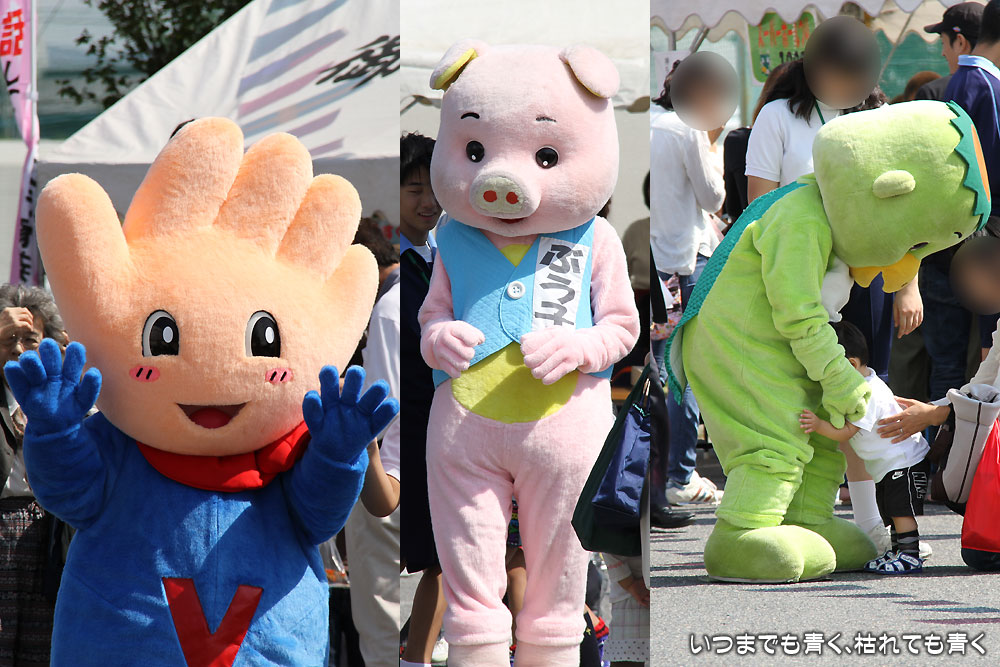 ![]() ブラスバンドとカラーガードの演奏・演技 | ![]() たくさんの屋台と人 |