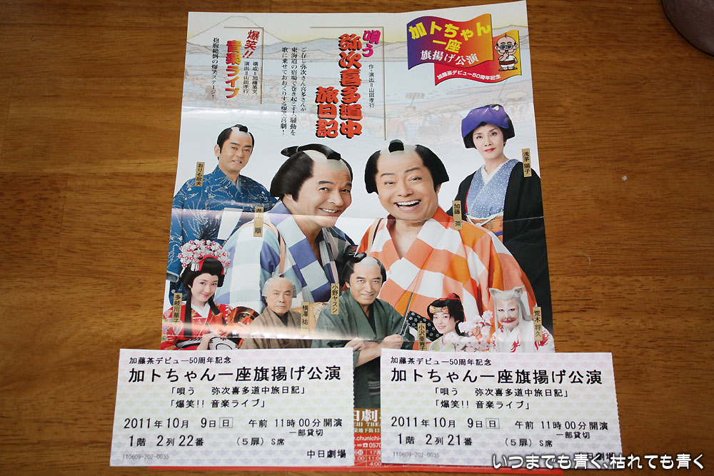 昨年は、「思いっ切り笑ってきました!「志村魂5」」で書きましたように志村けんの舞台で思いっきり笑ってきましたので、今年もできれば志村けんの「志村魂」に行きたいなぁと思っていたのですが、結果的には加トちゃん一座もとてもよかったですね。「唄う弥次喜多道中旅日記」は前半1時間、後半1時間20分、「爆笑!!音楽ライブ」は45分と、正味3時間、たっぷりと楽しませていただきました。