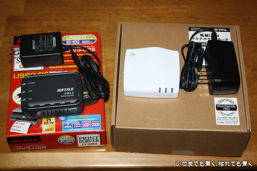![]() 左 有線プリントサーバー BUFFALO LPV3-U2S 4,336円 | ![]() 右 無線LANマルチポケットルータ PLANEX FFP-PKR03(MZK-MF300N2) 1,999円 |
