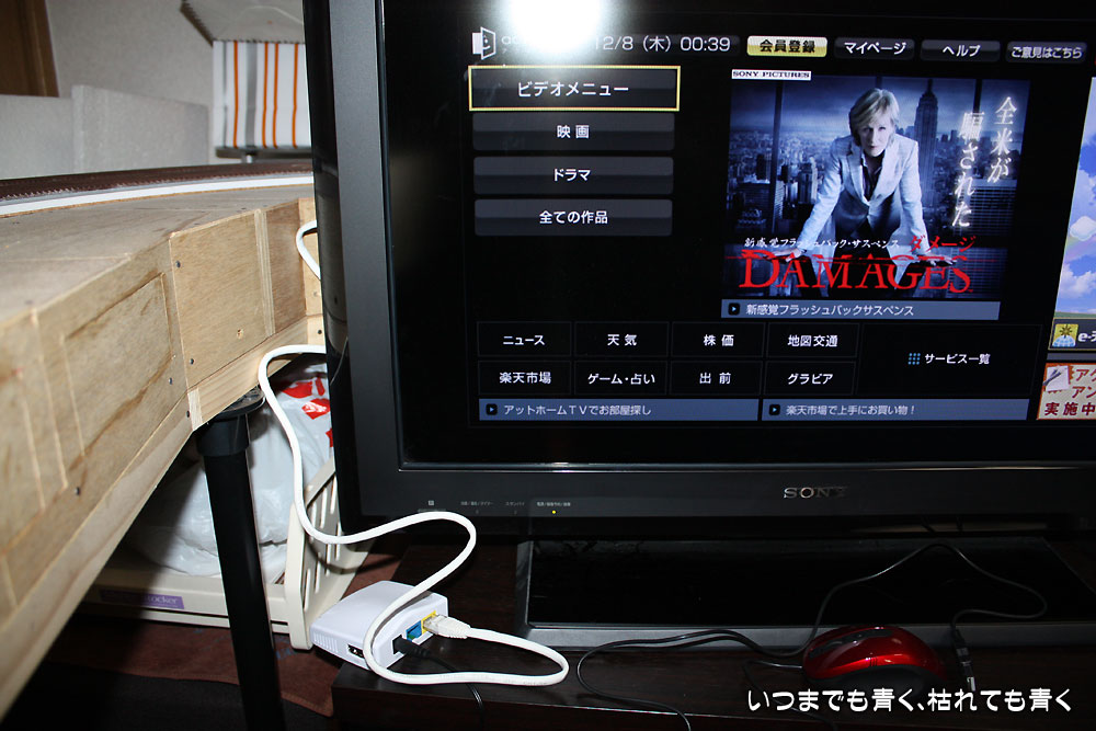 そこで考えたのが、無線LANを有線LANに変換するコンバータを使えば良いということです。これならば、KDL-26J5をそのまま寝室で使うことができます。それで調べて買ったのが、PLANEX FFP-PKR03(1,999円)というマルチポケットルータなのです。ちなみに、FFP-PKR03というのはAmazon専用品番で、MZK-MF300N2という製品の付属品からUSB給電ケーブルを外したものです。このマルチポケットルータは、ルータ、アクセスポイント、コンバータの三役をスイッチで切り替えられるスグレモノです。さっそく設定。ルーター(NEC WR8170N)との間は、WPS機能により簡単にセットアップ完了。セットアップが終わったら、KDL-26J5につなげてテスト。何の問題もなくインターネットにつながりました。BRAVIAを無線LAN化するのに、UWA-BR100を買うのを躊躇っている皆さん、この方法ならば安価にBRAVIAを無線LAN化できますよ。