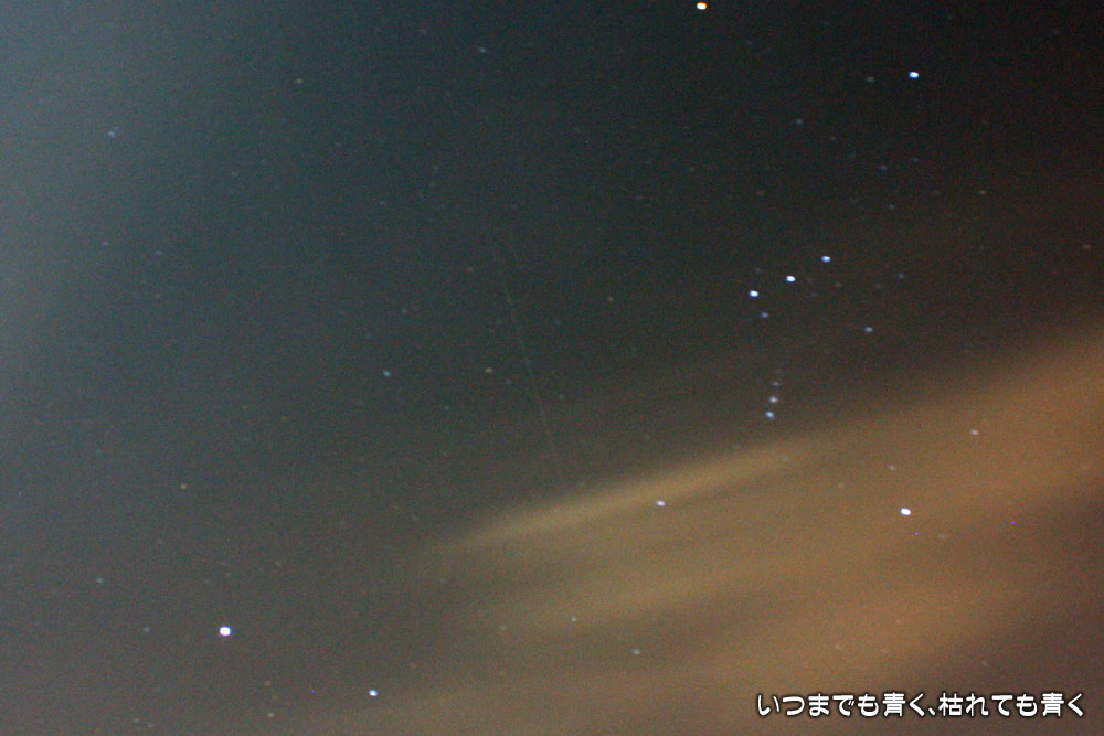 寒いうえに雲が出てきたので、長女に、「あと100数えたら撮影はきっぱりあきらめて部屋に戻る」と言って、一番流れ星が現れそうな向きにカメラをセットして最後の望みにかけましたが、100を数え終わっても流れ星は現れませんでした。仕方がないので、三脚を抱えて戻ろうとしたその時、カメラを向けていた空に、長く尾を引く流れ星が・・・