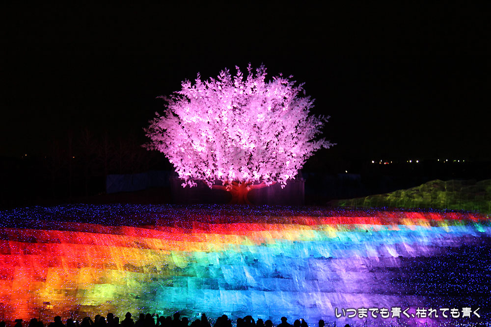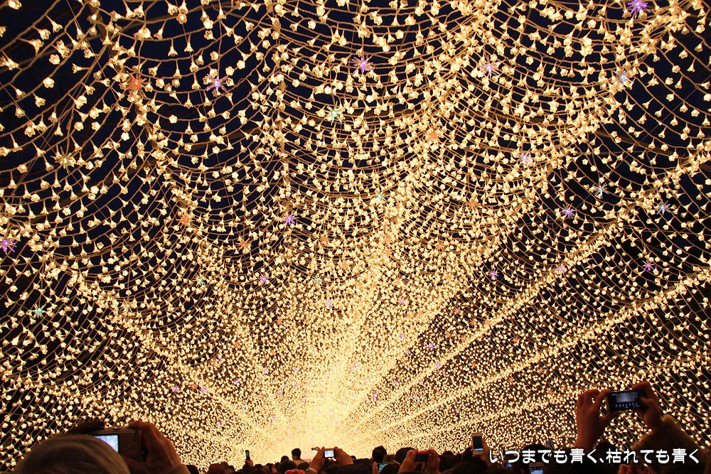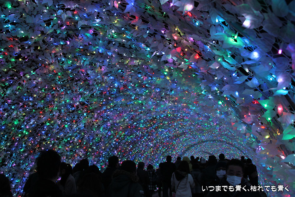 イルミネーションは予想以上に素晴らしかったです。テーマは「日本の四季」。光のトンネルがクローズアップされているようなところがありますが、ジプシーキングスのインスピレーションという曲に乗せて日本の四季がイルミネーションで変化していく様子は、幻想的で感動すら覚えます。ちなみに、この曲は鬼平犯科帳のエンディングで流れる曲でもあり、昔から私が好きだった曲です。