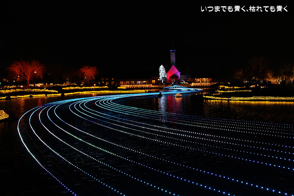 ![]() 水上イルミネーションと教会 | ![]() 水上イルミネーションとアイランド富士 |