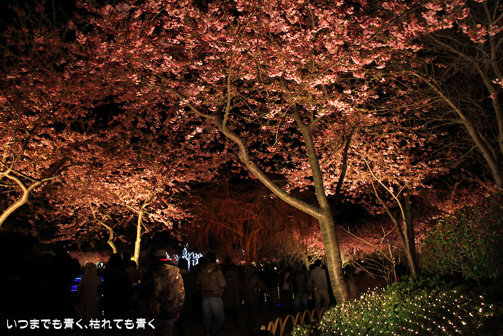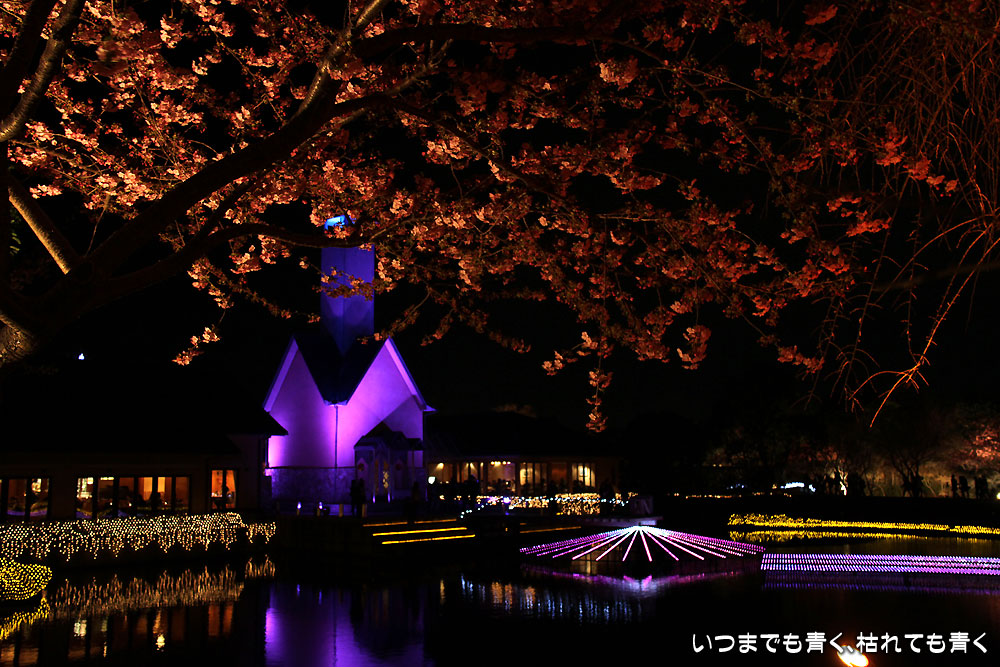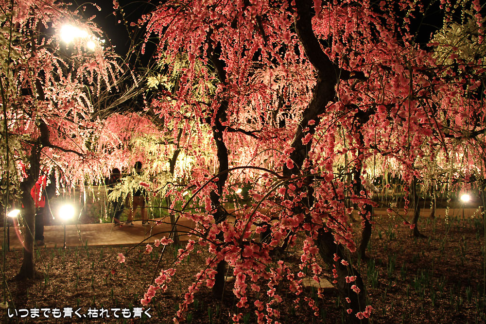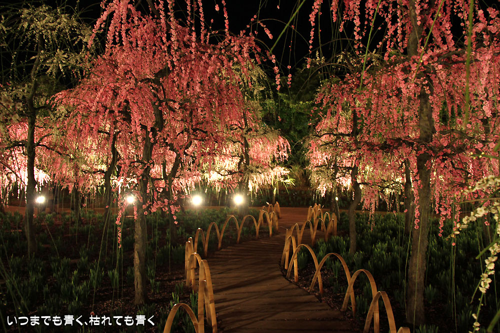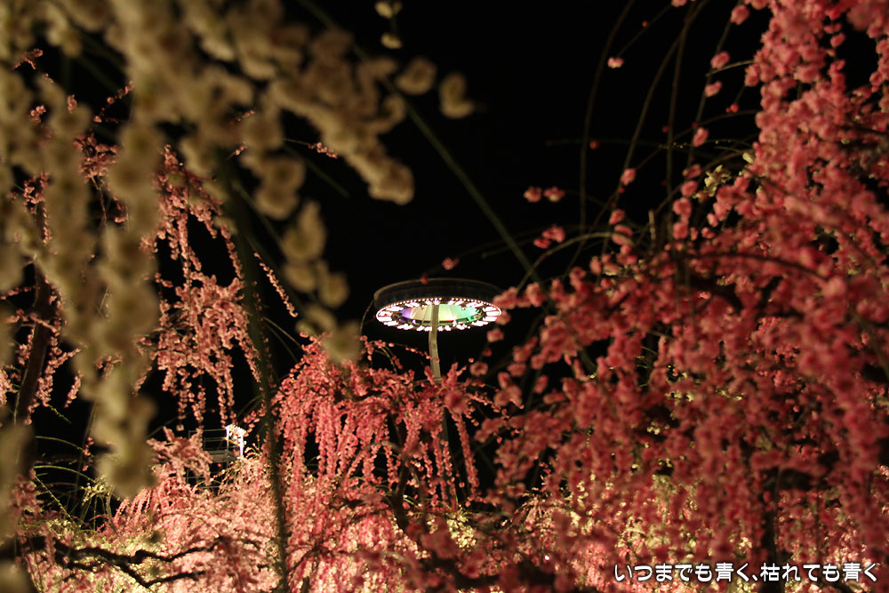 2月に来たときは裸木でちょっと寂しい夜景でしたが、今回は桜と梅の花が光を受けてまったく違った光景を見せてくれました。